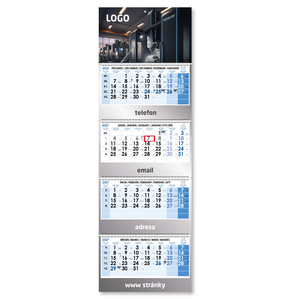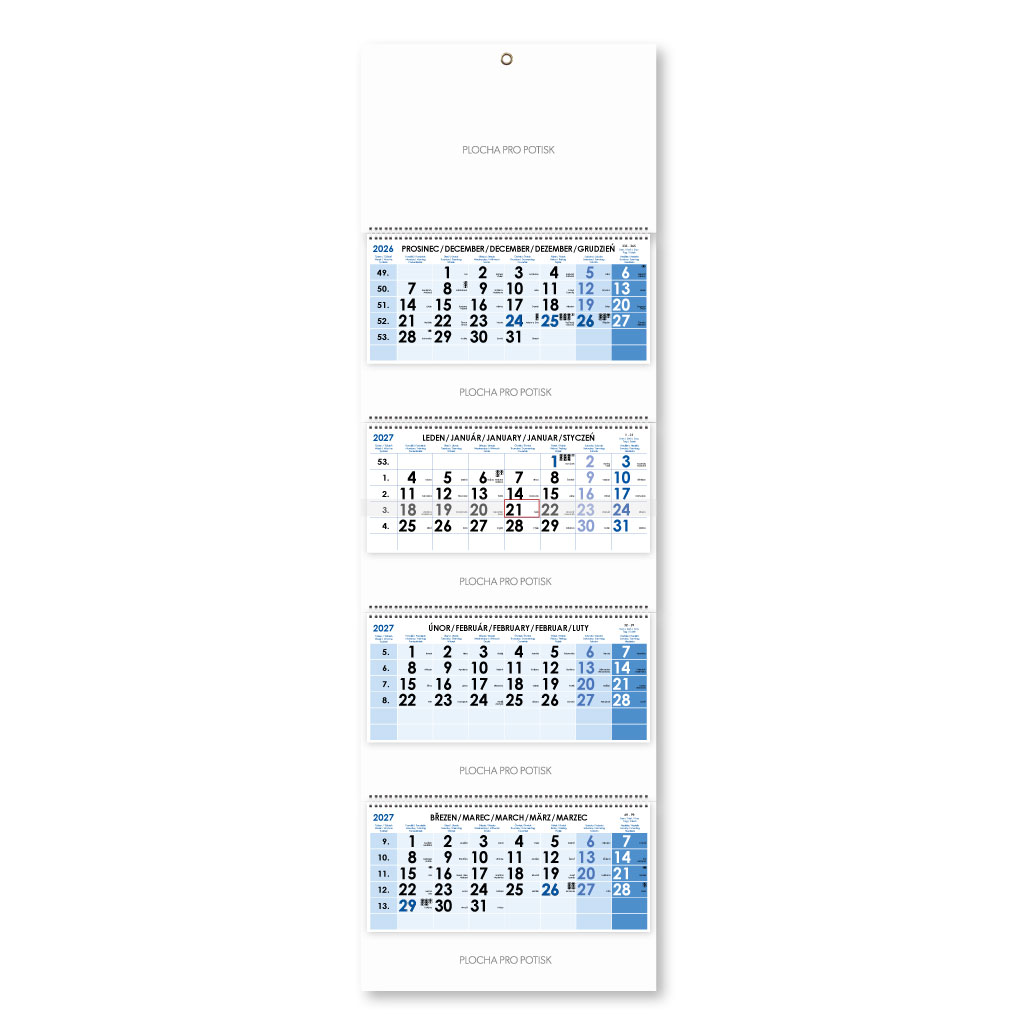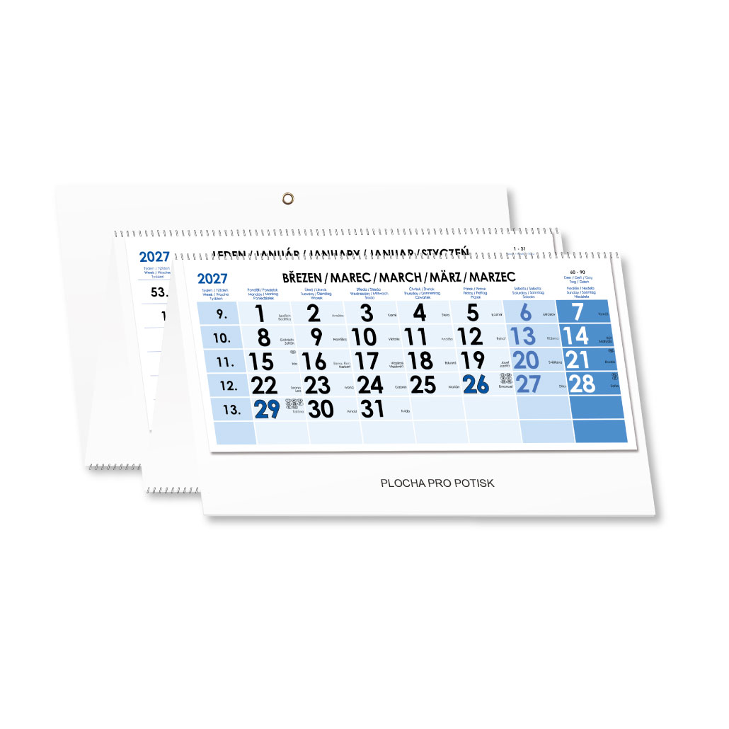 Czteromiesięczny kalendarz Kvatro składany czeski ze spiralą 2027 - niebieski