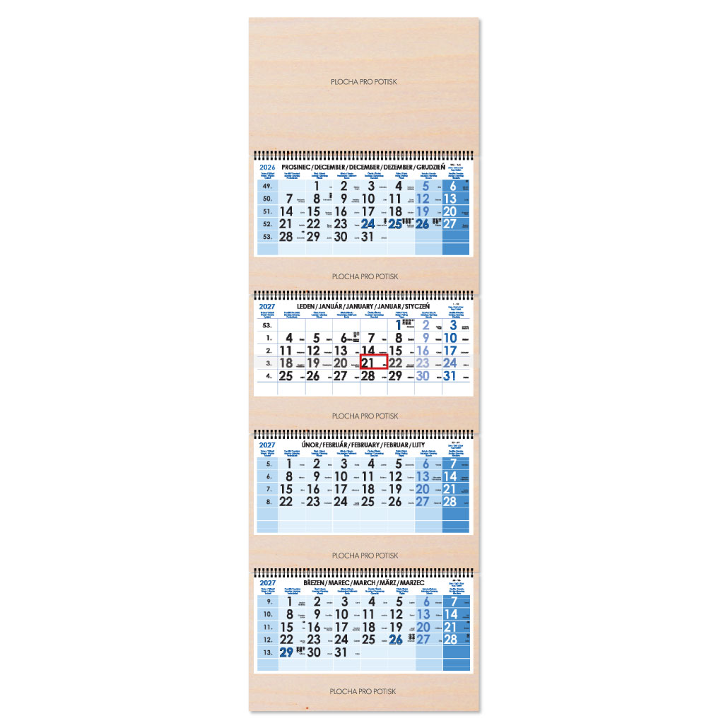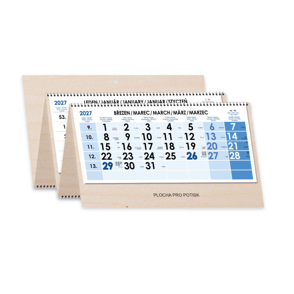 Drewniany czteromiesięczny kalendarz Kvatro Wood składany czeski ze spiralą 2027 - niebieski