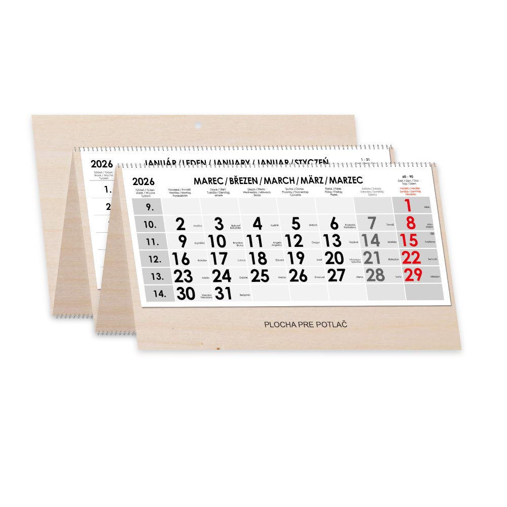 Drewniany czteromiesięczny kalendarz Kvatro Wood składany slowacki ze spiralą 2026 - szary