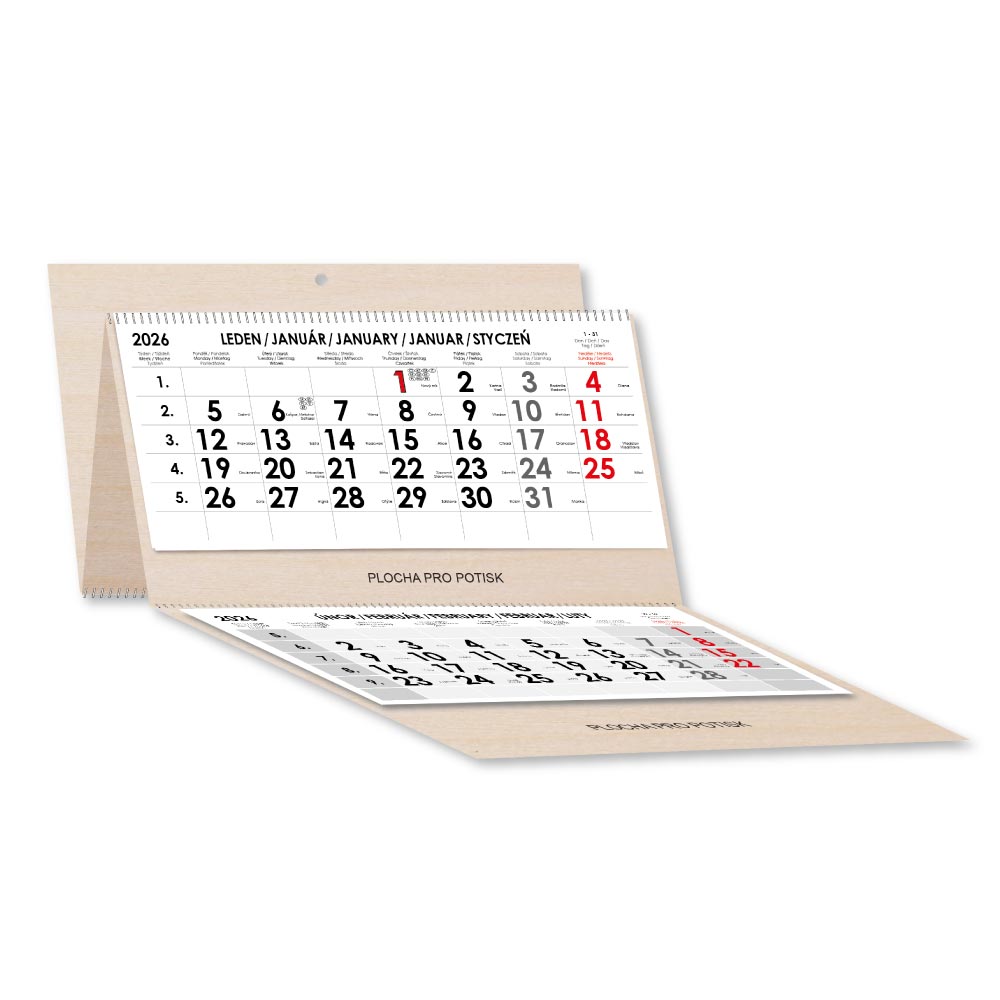 Drewniany trzymiesięczny kalendarz Trio Wood składany czeski ze spiralą 2026 - szary