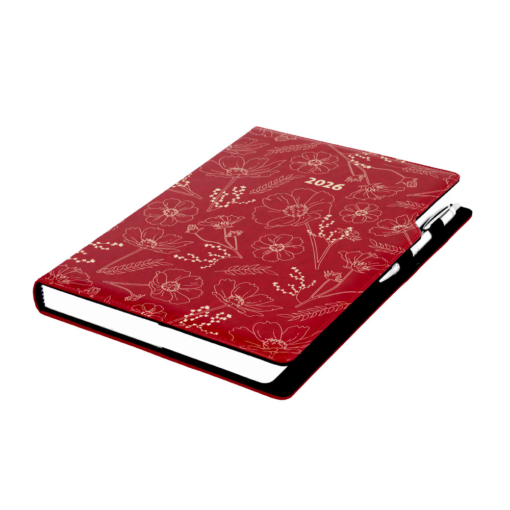 Kalendarz książkowy DESIGN dzienny A4 2026 - bordowy - kwiaty