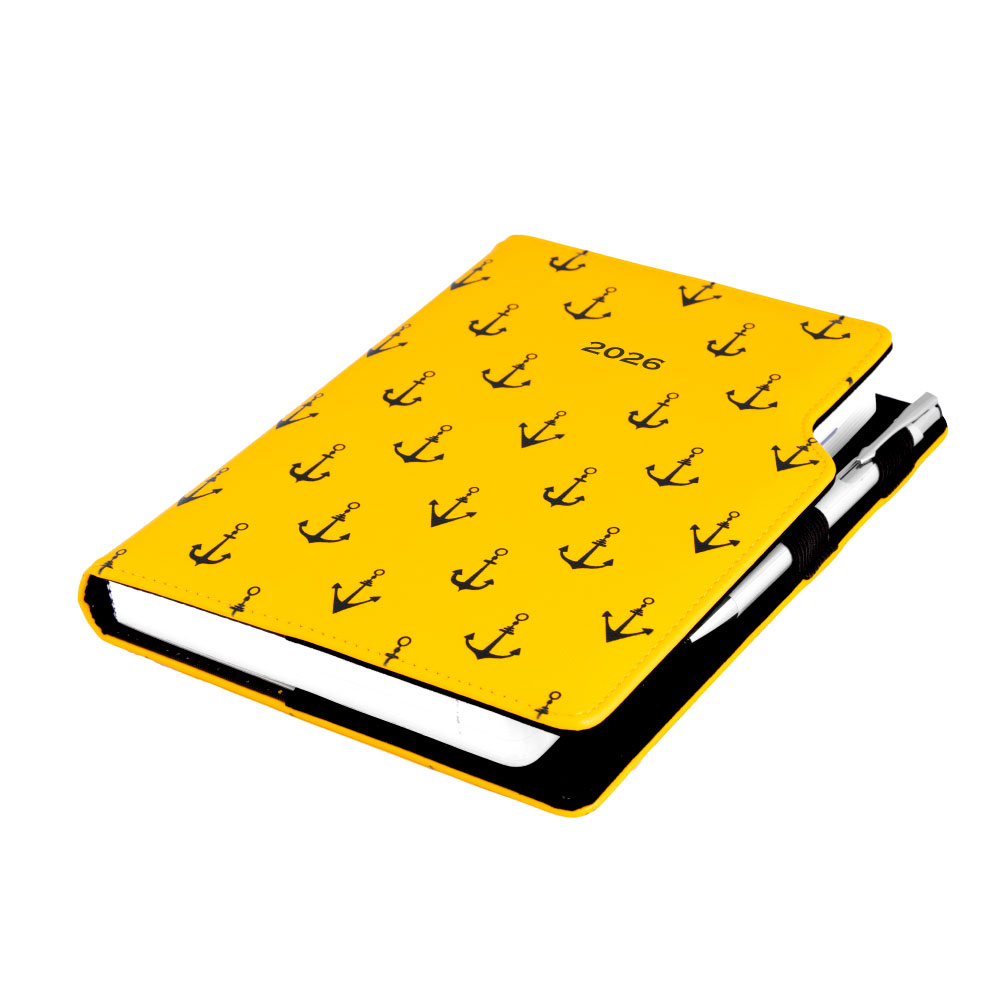 Kalendarz książkowy DESIGN dzienny B6 2026 - żółty - marynarski- kotwice