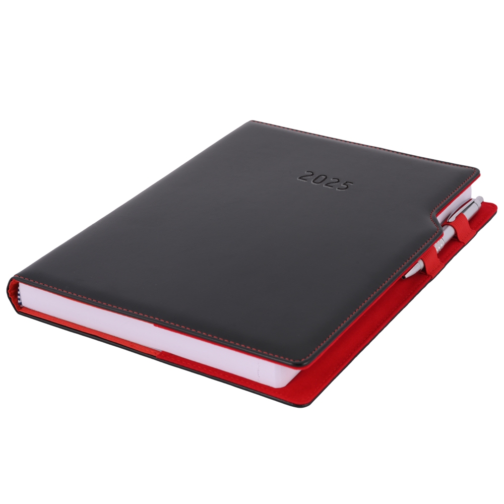 Kalendarz książkowy GEP z długopisem dzienny A4 2025 polski - czarny (czerwone wnętrze)