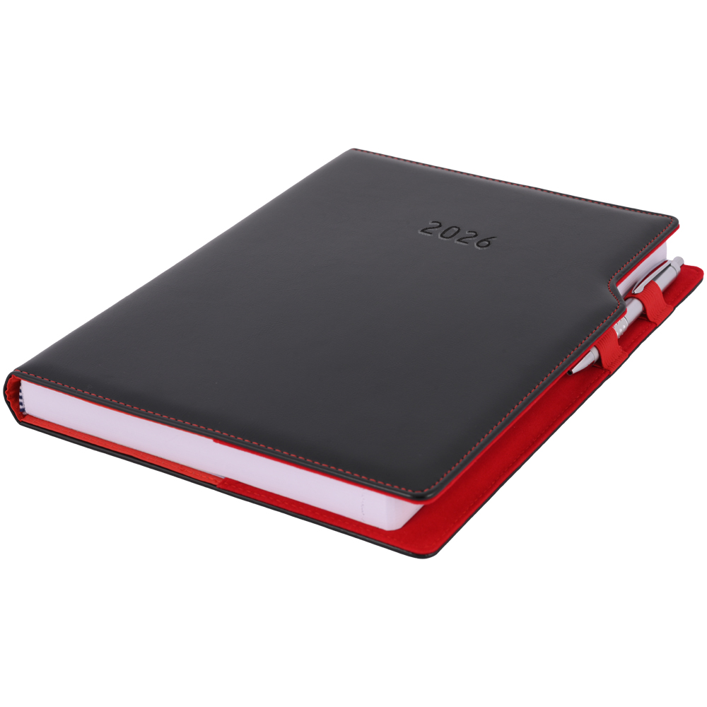 Kalendarz książkowy GEP z długopisem dzienny A4 2026 polski - czarny (czerwone wnętrze)