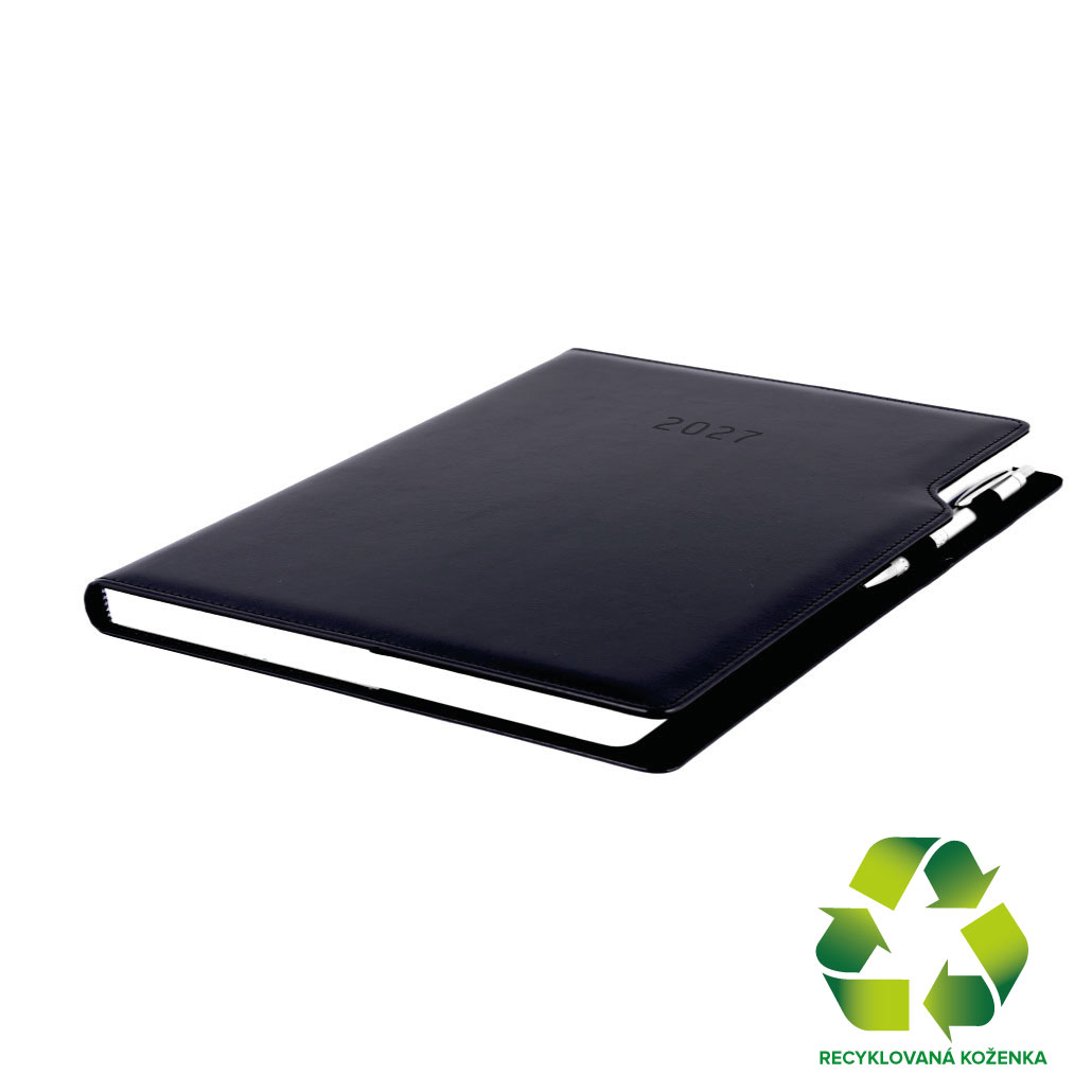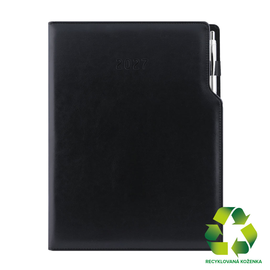 Kalendarz książkowy GEP z długopisem tygodniowy A4 2027 CZ/SK - czarny (czarne wnętrze) - skóra ekologiczna z recyklingu