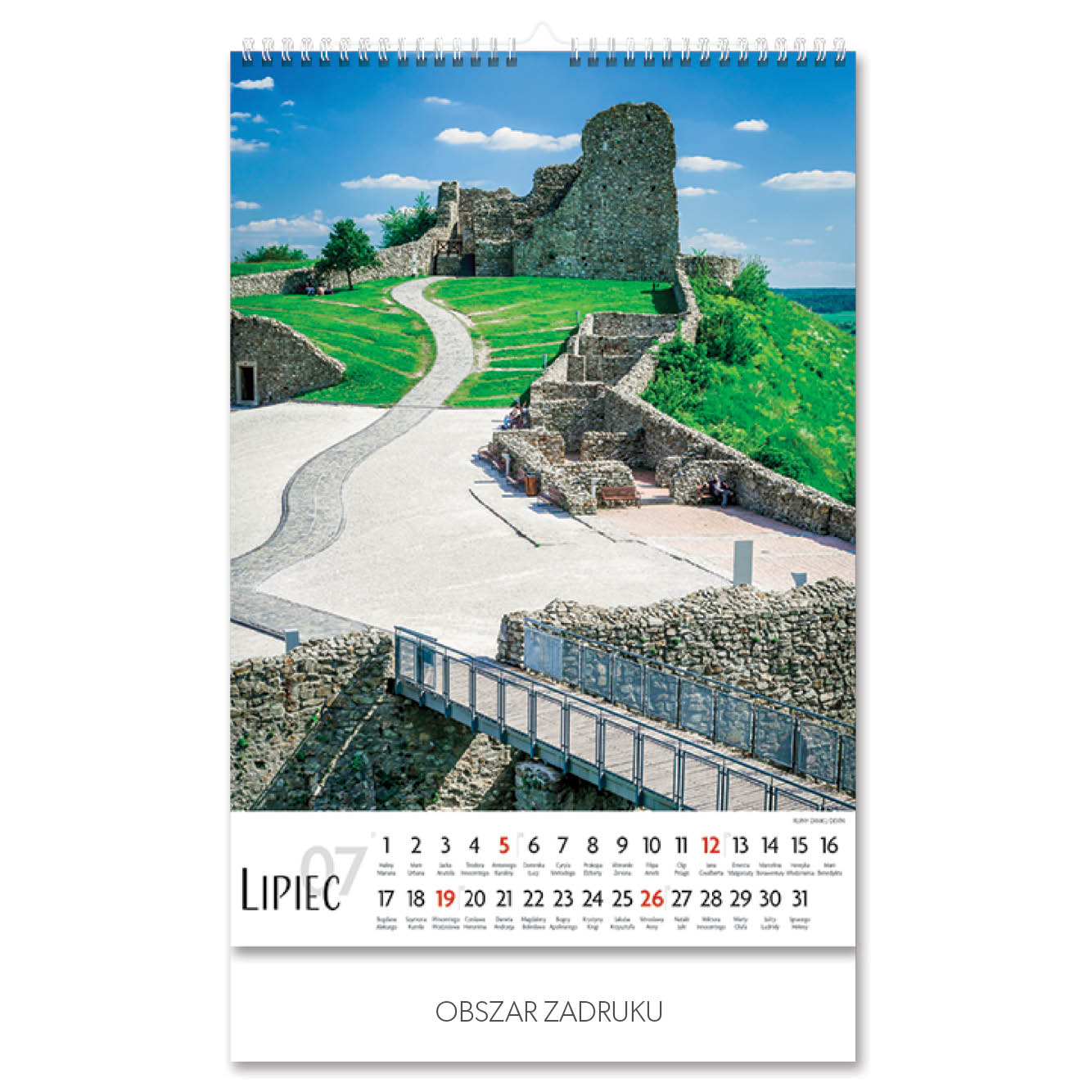Nadruk na stopce (pleckach). Możliwość produkcji kalendarza na zamówienie (na zapytanie, według specyfikacji).