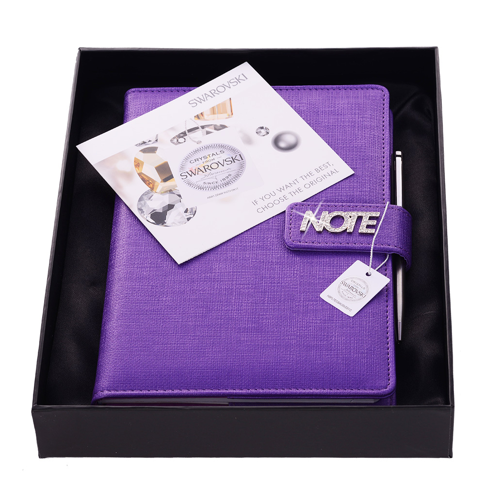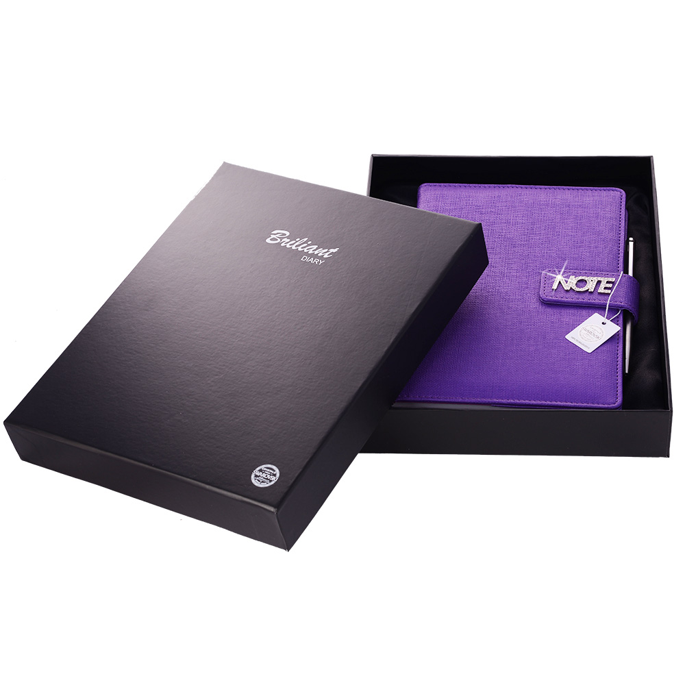 Notatnik zawiera: pętelkę na długopis, metalowy długopis oraz magnetyczne zamknięcie.