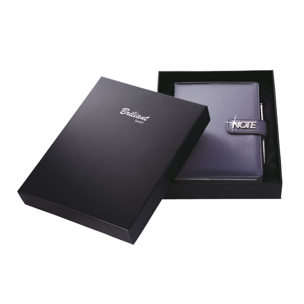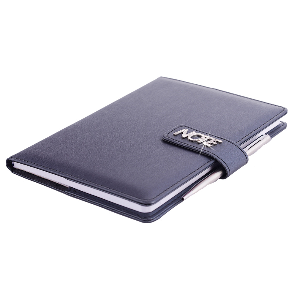 Notatnik zawiera: pętelkę na długopis, metalowy długopis oraz magnetyczne zamknięcie.