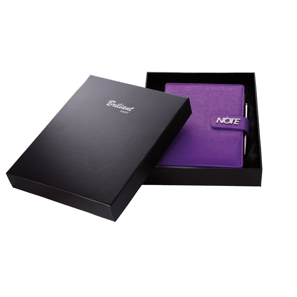 Notatnik zawiera: pętelkę na długopis, metalowy długopis oraz magnetyczne zamknięcie.
