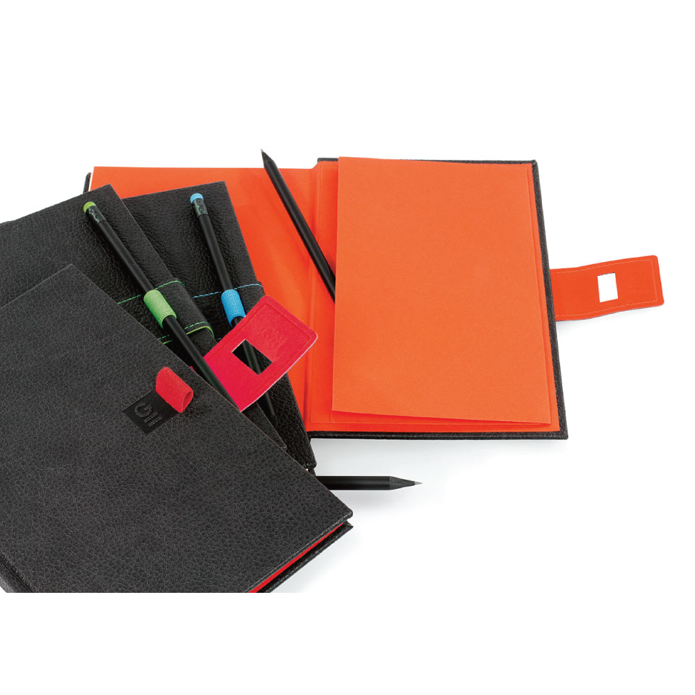 Notatnik zawiera papierową kieszeń, pętelkę na długopis