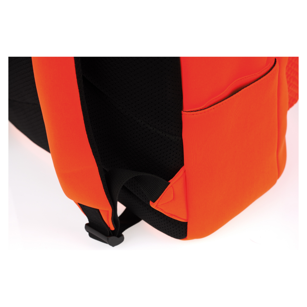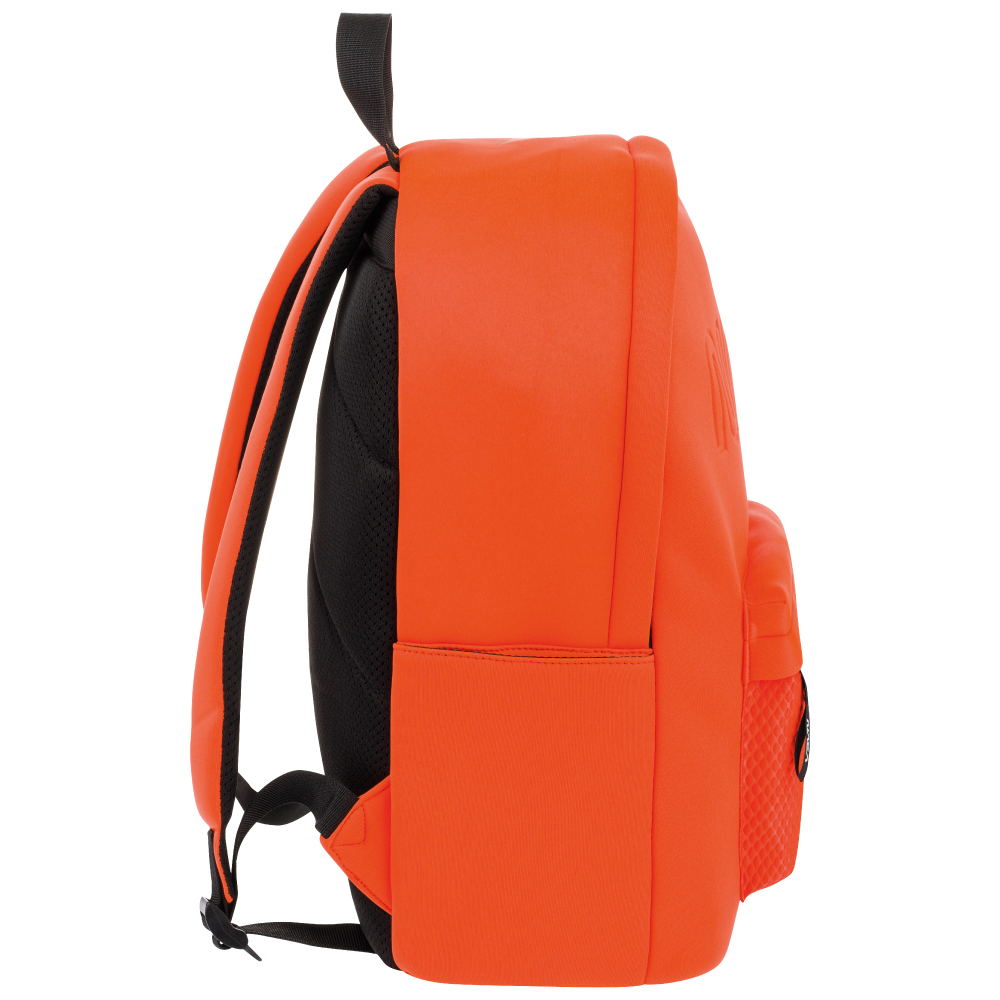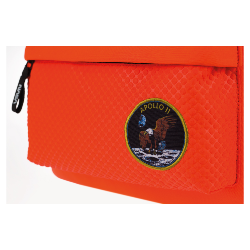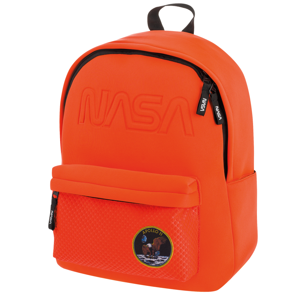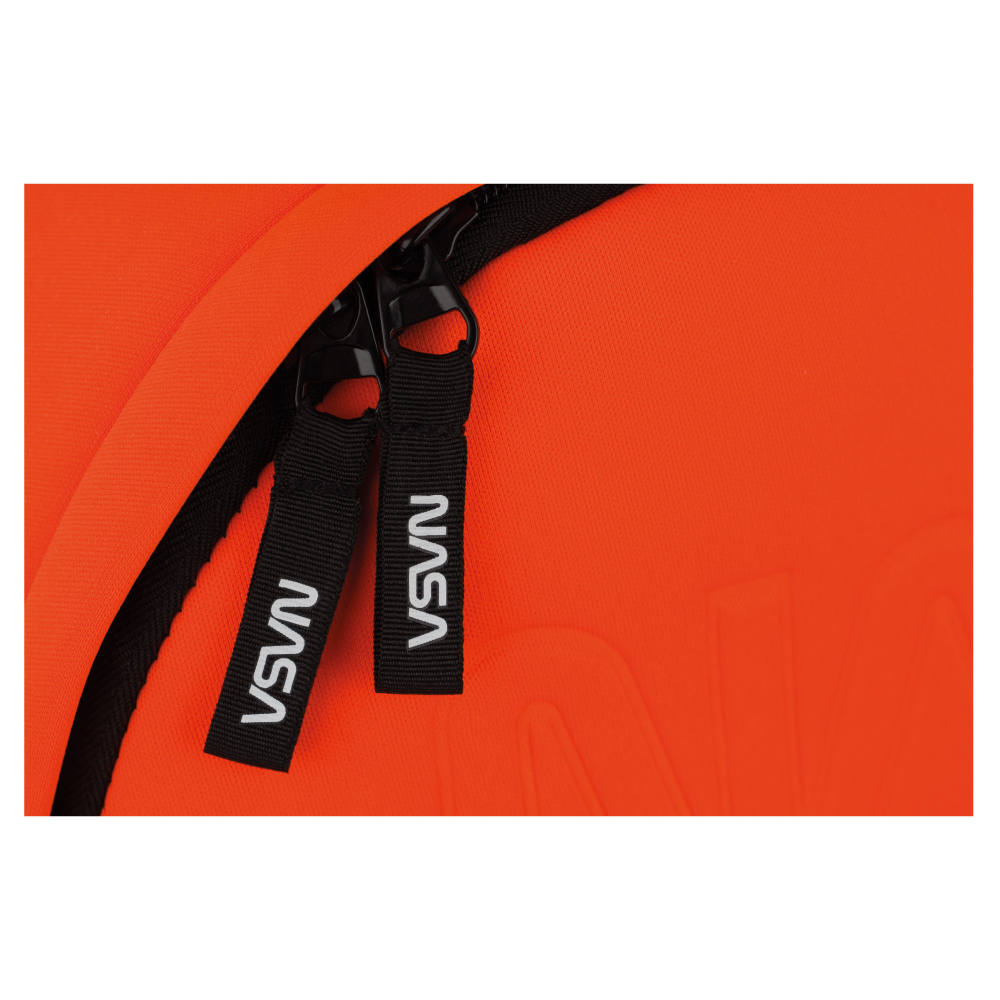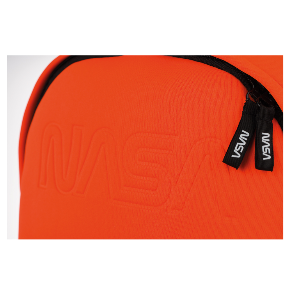 • Pomarańczowy plecak neopren z wodoodpornego materiału z logiem NASA a tematyczną naszywką.