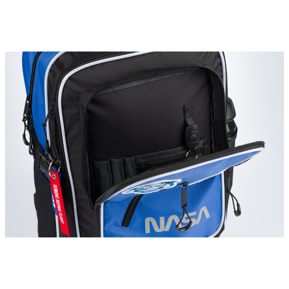 • Przednia kieszeń plecaka zawiera praktyczny organizer oraz pętlę z karabińczykiem do zawieszenia kluczy.
