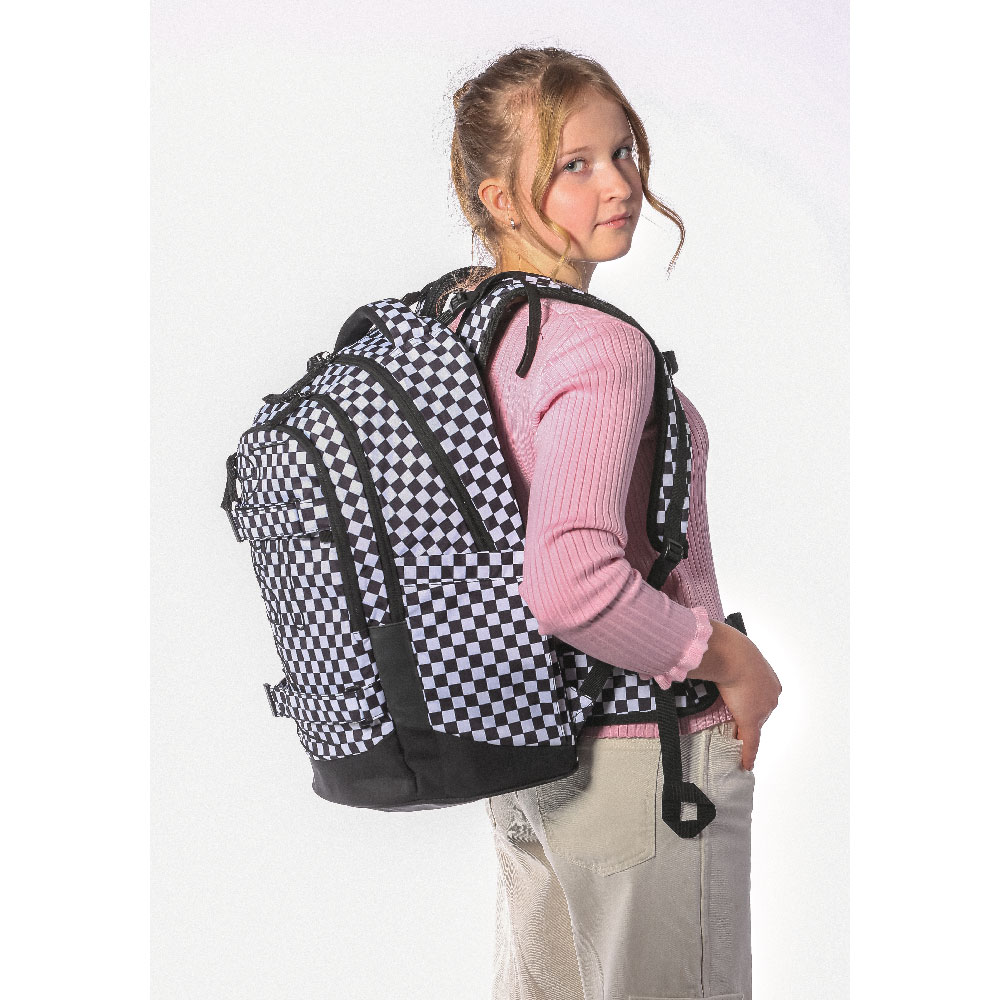 • Ergonomiczny plecak szkolny z trzema osobno zamykanymi komorami z wewnętrznym organizerem i 15-calową przegrodą na laptopa lub na tablet.