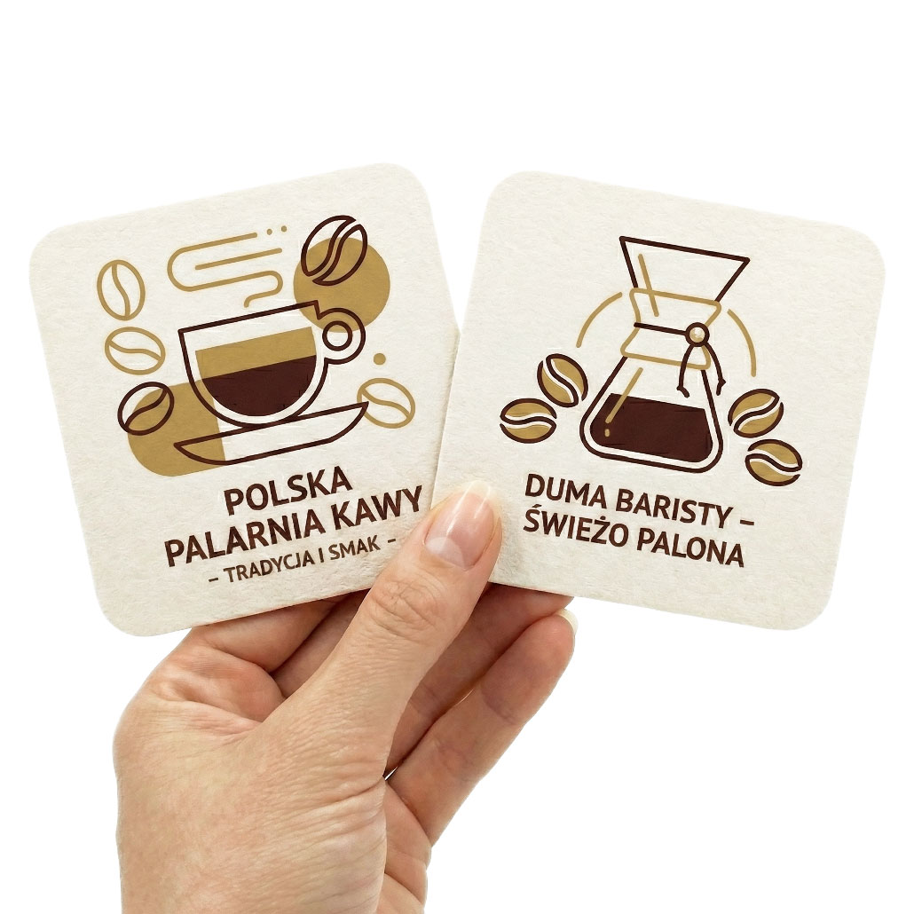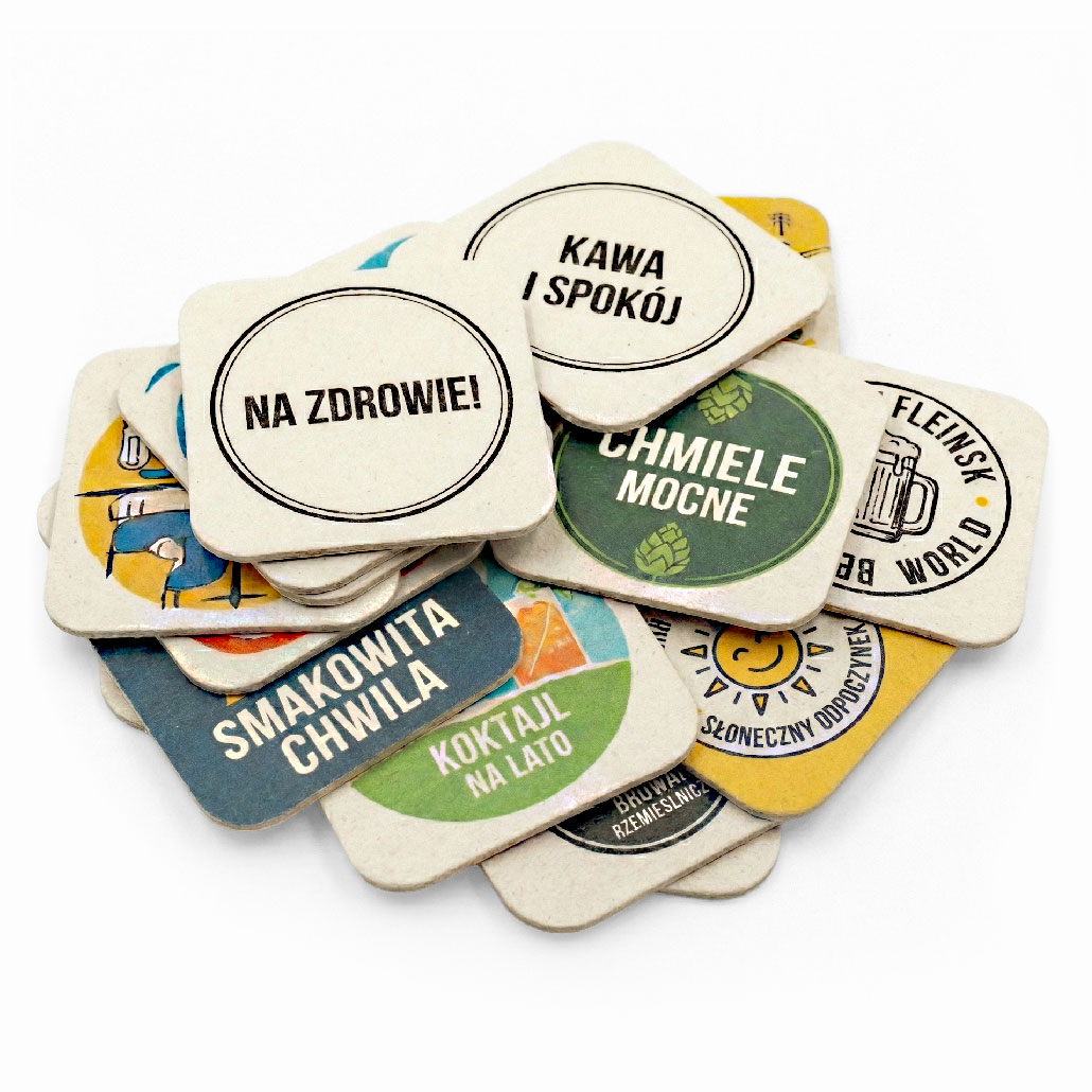 Produkujemy podstawki z nadrukiem jednokolorowym lub pełnokolorowym CMYK, możemy również zadrukować je kolorem białym i lakierem.