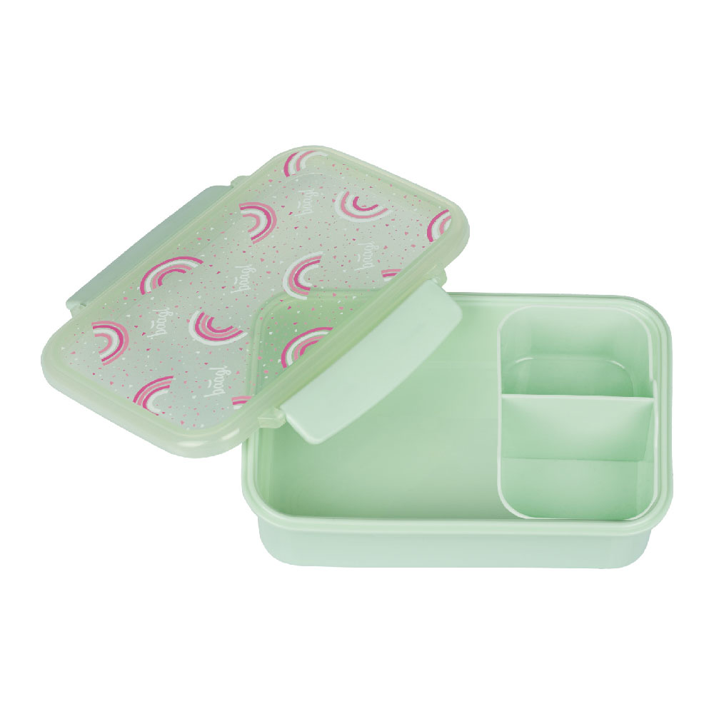 • Plastikowe pudełko zawiera wyjmowane przegródki, które umożliwiają oddzielenie poszczególnych posiłków.