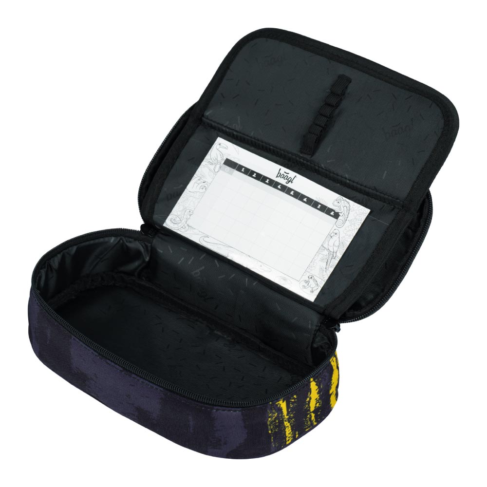 • Twardy piórnik szkolny ze składaną wewnętrzną przegrodą.
