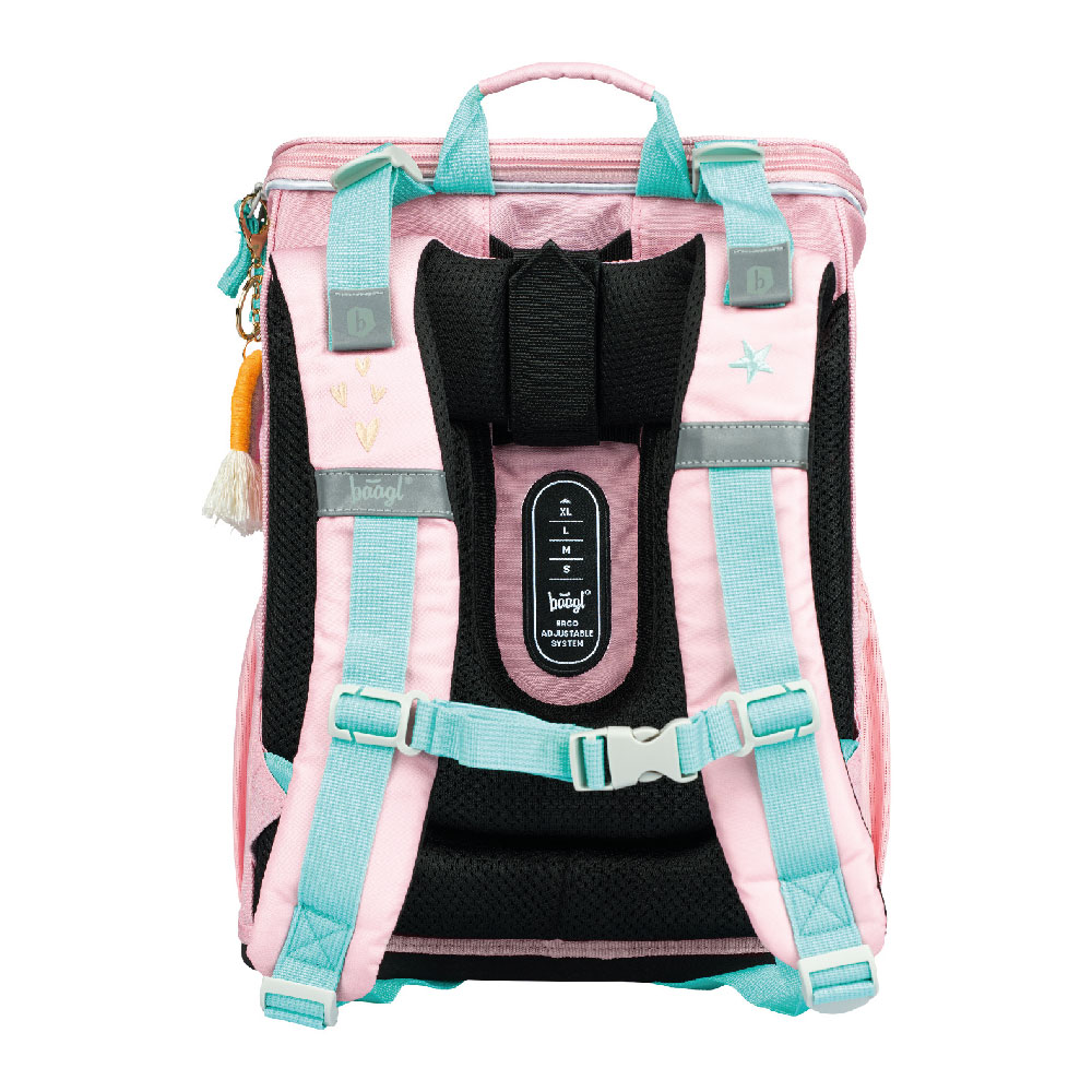 • System przesuwnego panelu tylnego BAAGL ADJUSTABLE SYSTEM umożliwia dostosowanie optymalnej pozycji szelek, w stosunku do wzrostu dziecka.