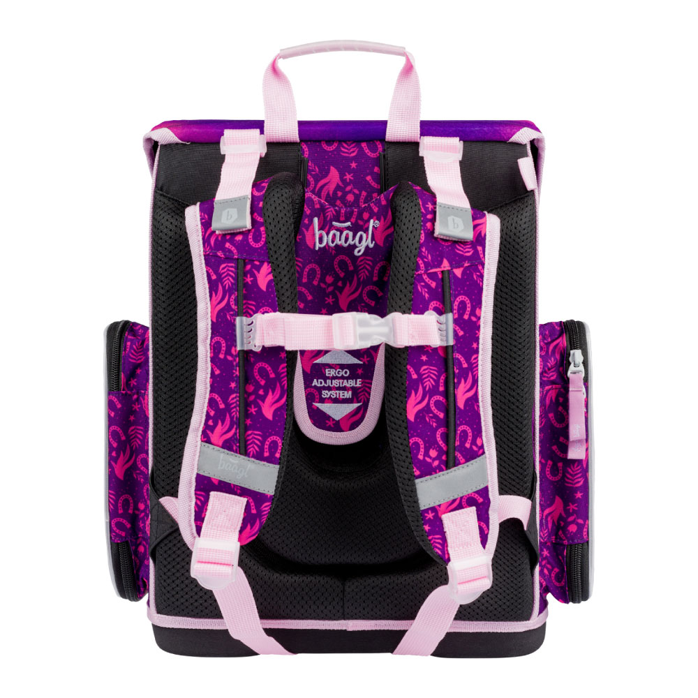 • System przesuwnego panelu tylnego BAAGL ADJUSTABLE SYSTEM umożliwia dostosowanie optymalnej pozycji szelek, w stosunku do wzrostu dziecka.