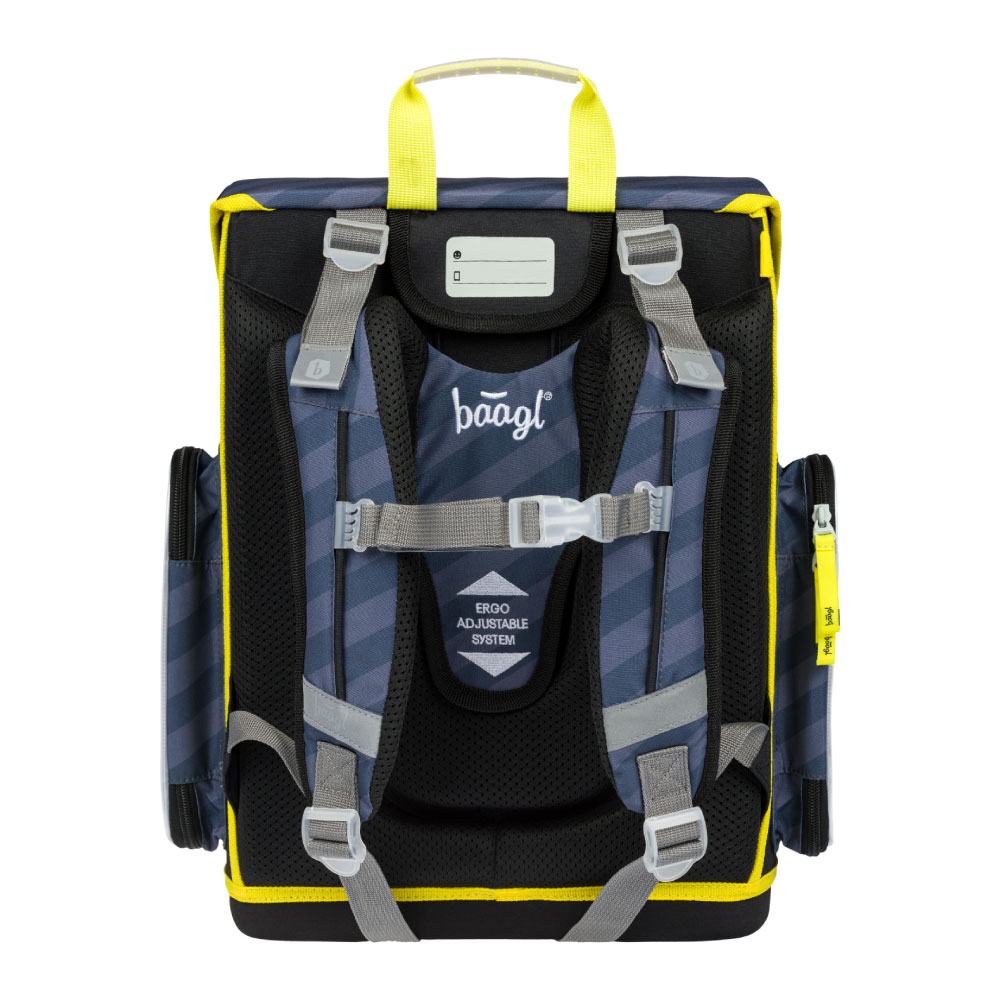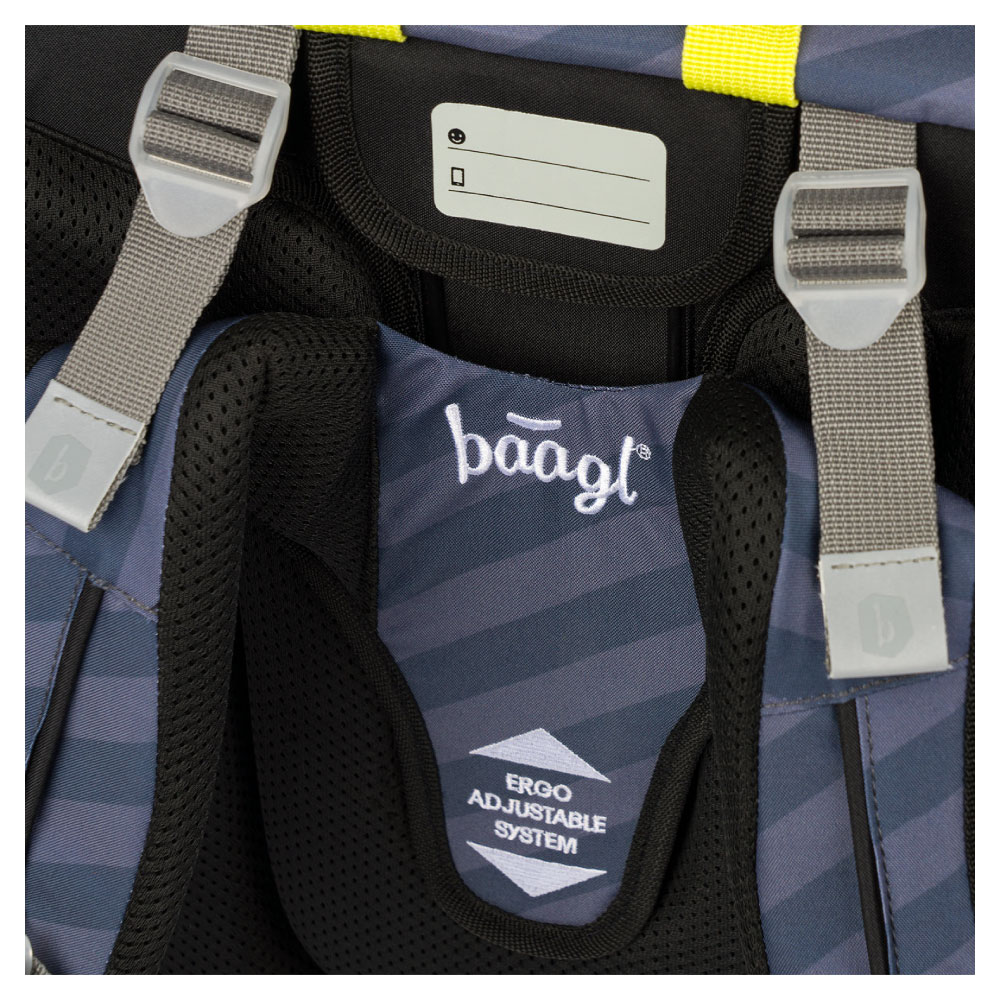 • System przesuwnego panelu tylnego BAAGL ADJUSTABLE SYSTEM umożliwia dostosowanie optymalnej pozycji szelek, w stosunku do wzrostu dziecka.