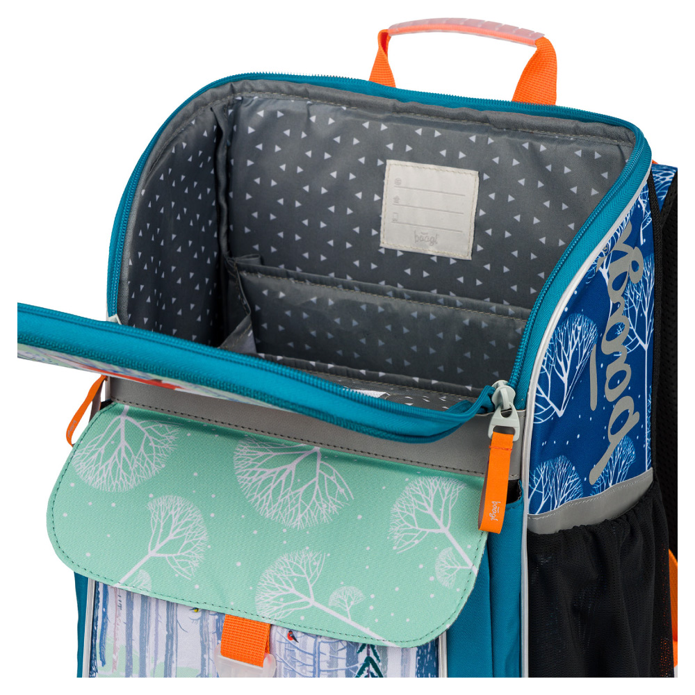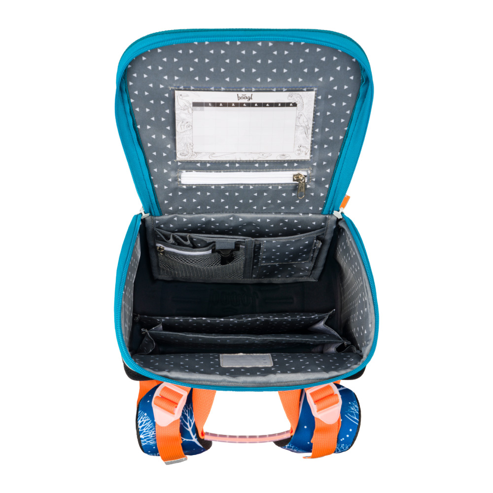 • Wewnątrz tornistra znajduje się przezroczysta kieszeń z planem zajęć i wewnętrznym organizerem, dla równomiernego rozłożenia ciężaru, wraz z elastyczną gumką.