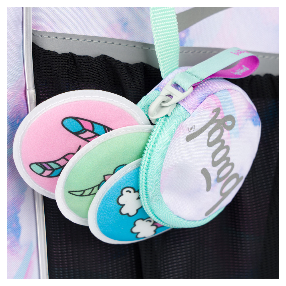 • Plecak jest wyposażony w odblaskową bransoletkę, praktyczny portfel, elementy odblaskowe i pokrowiec przeciwdeszczowy.