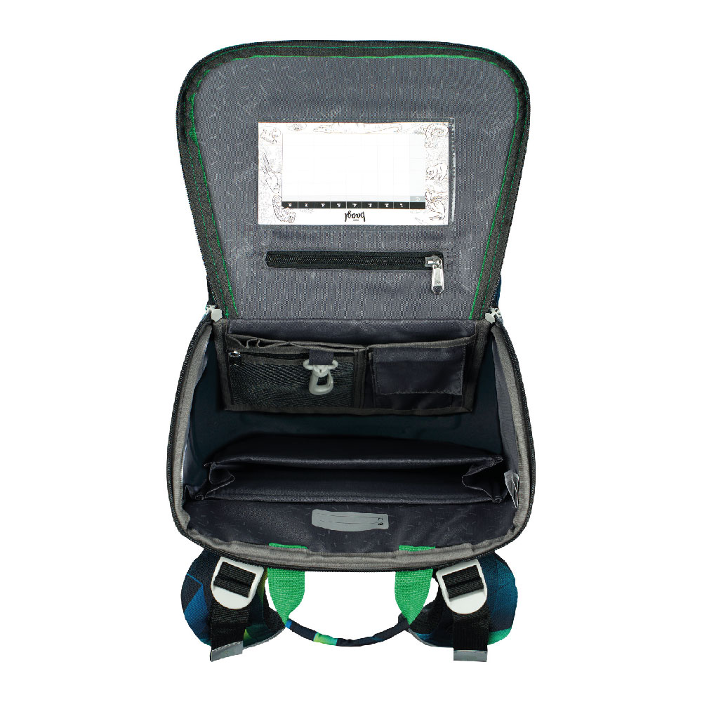 • Wewnątrz tornistra znajduje się przezroczysta kieszeń z planem zajęć i wewnętrznym organizerem, dla równomiernego rozłożenia ciężaru, wraz z elastyczną gumką.