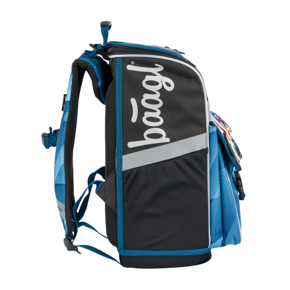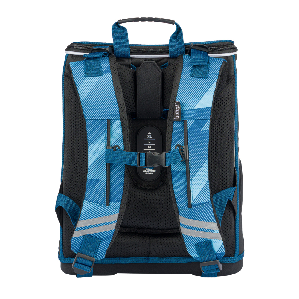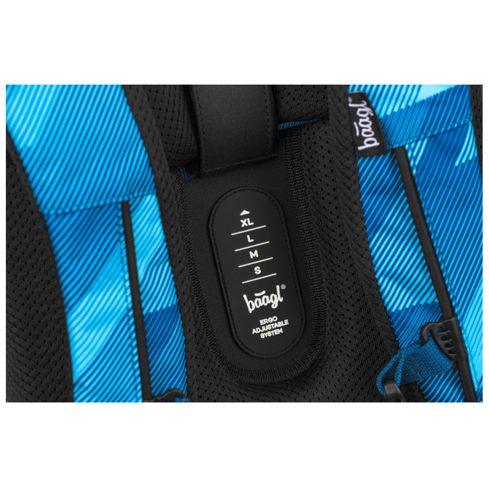 • System przesuwnego panelu tylnego BAAGL ADJUSTABLE SYSTEM umożliwia dostosowanie optymalnej pozycji szelek, w stosunku do wzrostu dziecka.