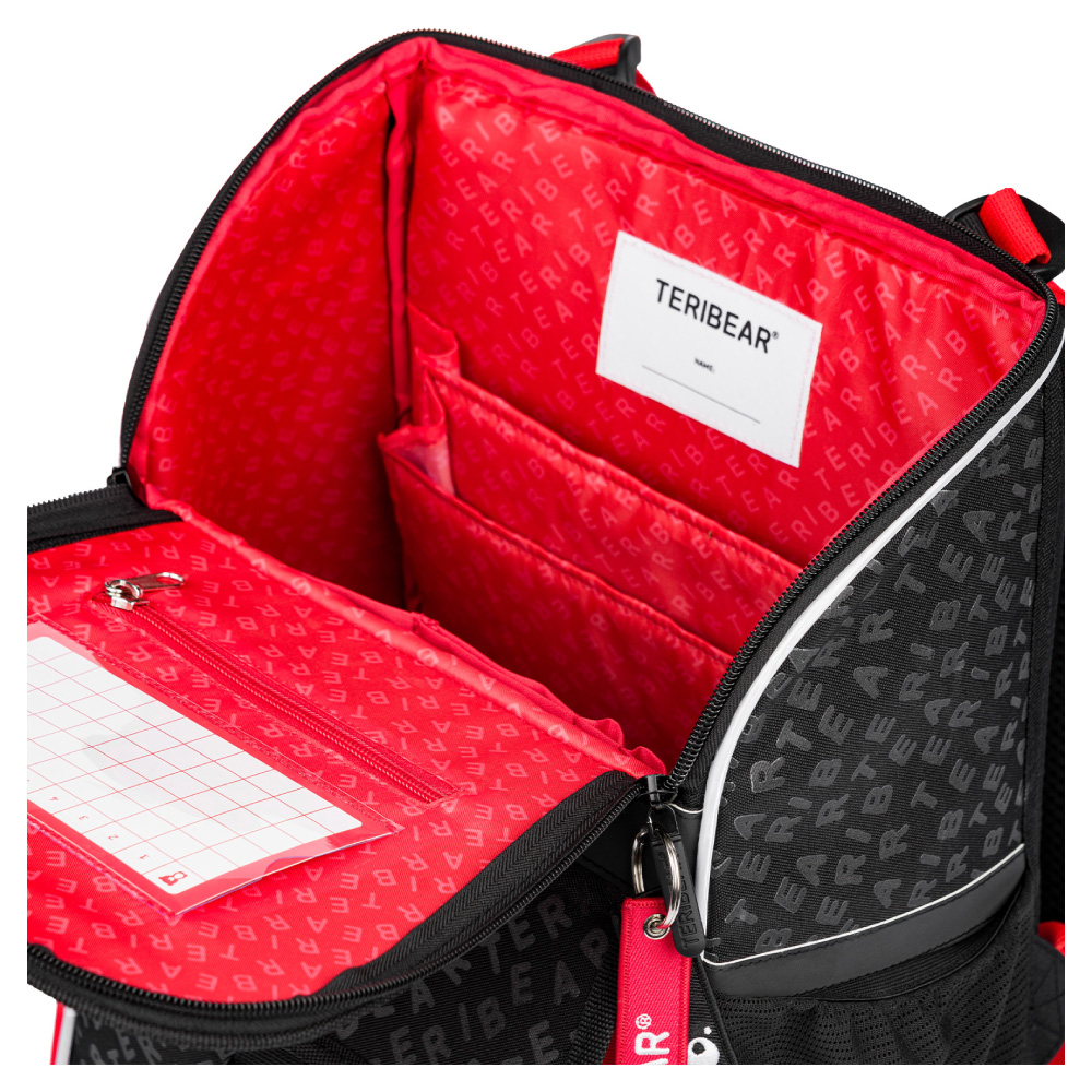 • Wewnątrz tornistra znajduje się przezroczysta kieszeń z planem zajęć i wewnętrznym organizerem, dla równomiernego rozłożenia ciężaru, wraz z elastyczną gumką.