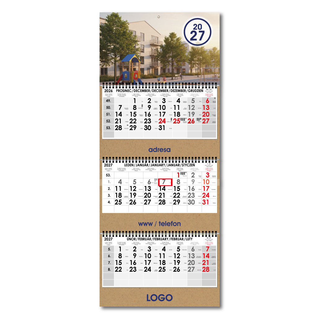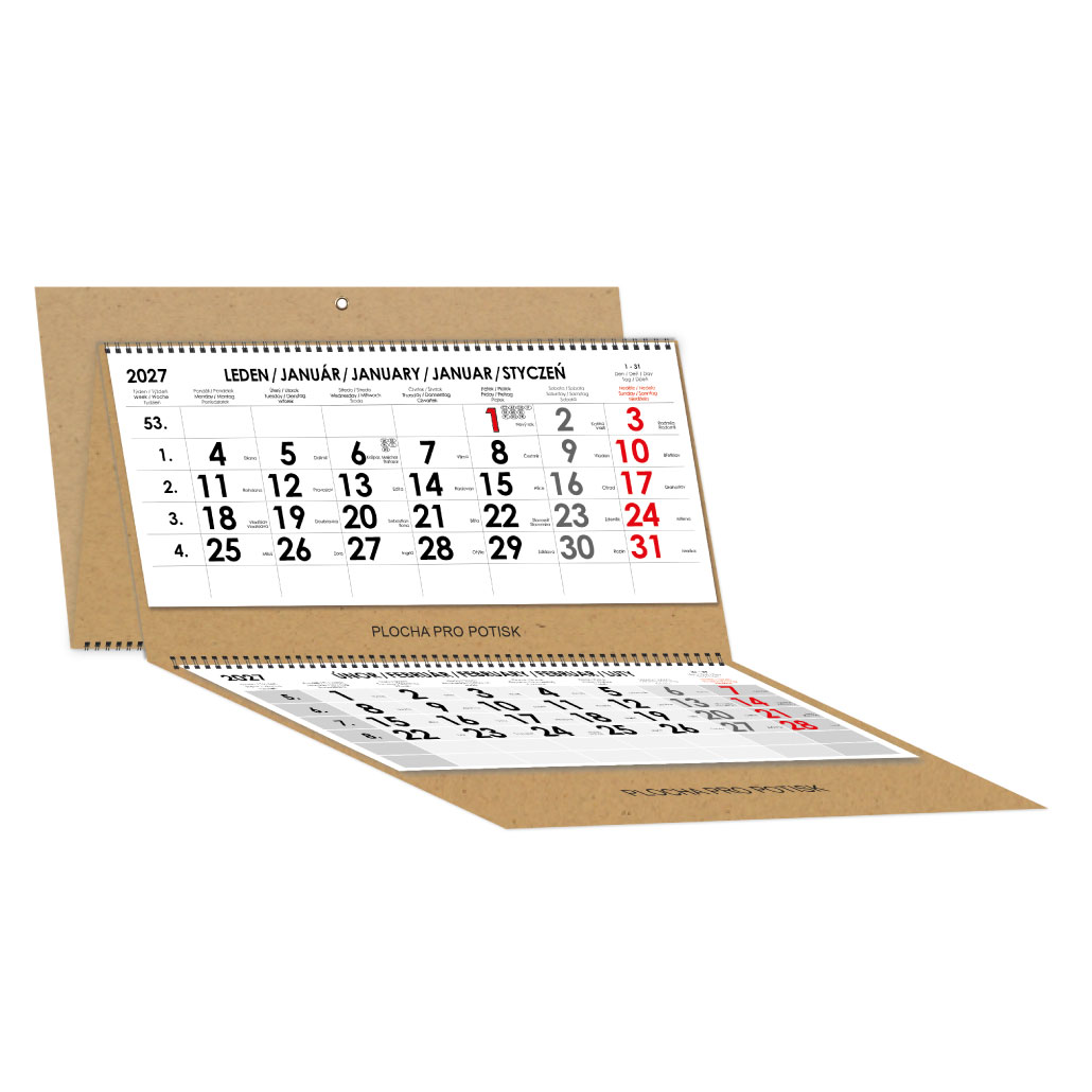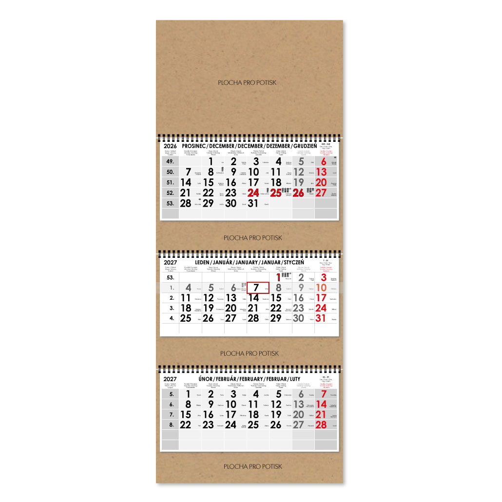 Trzymiesięczny kalendarz Trio Kraft składany czeski ze spiralą 2027 - szary