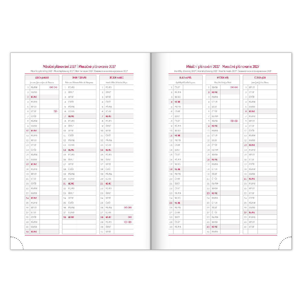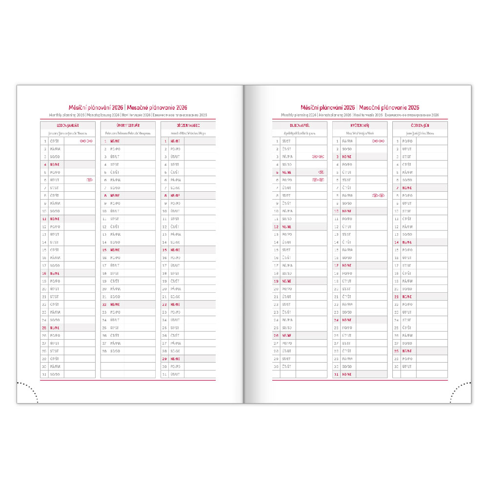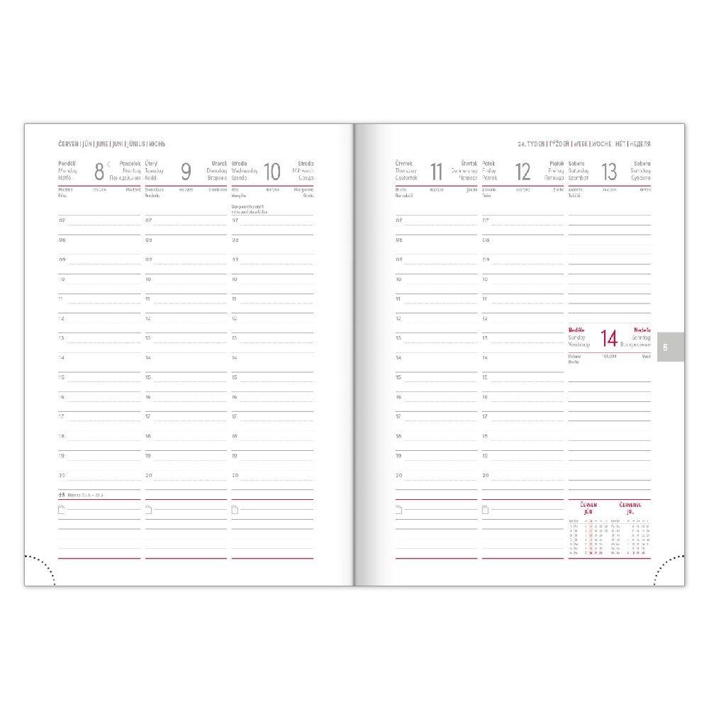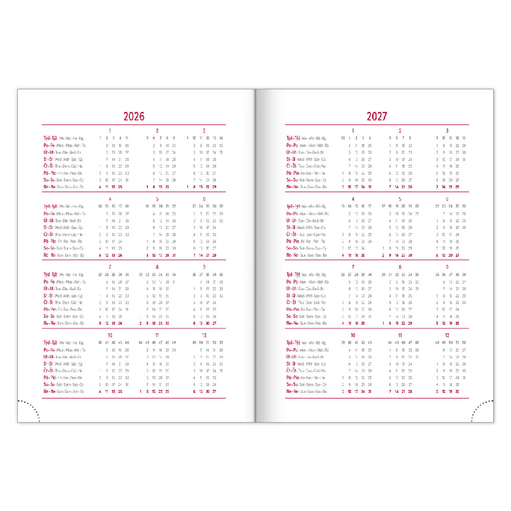 Kalendarz: tygodniowy w 6 językach (CZ, SK, EN, DE, HU, RU)