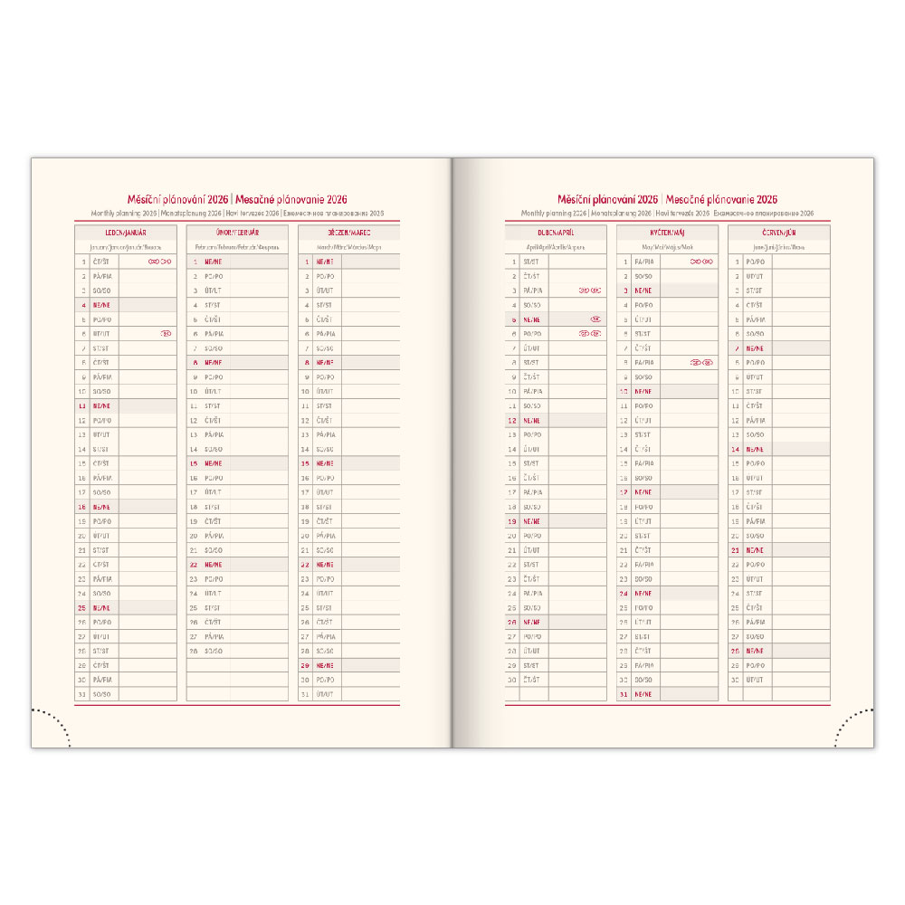 Kalendarz: tygodniowy w 6 językach (CZ, SK, EN, DE, HU, RU)