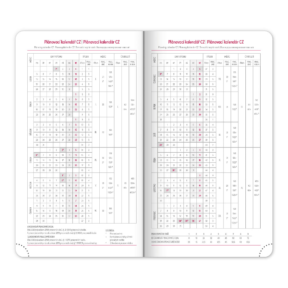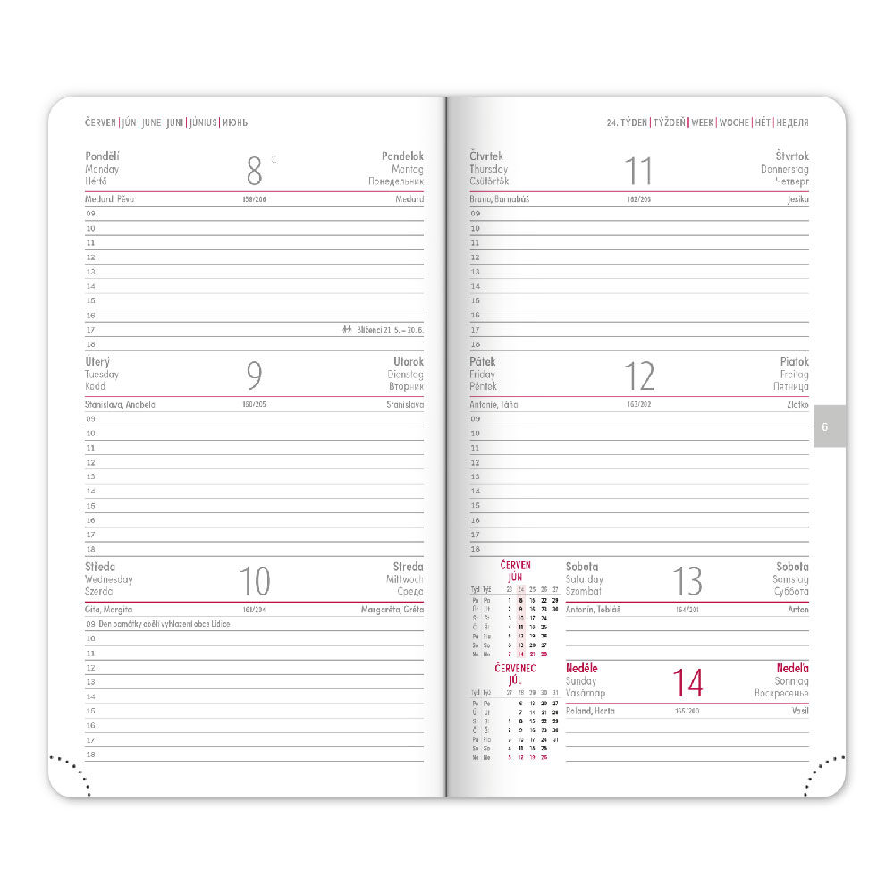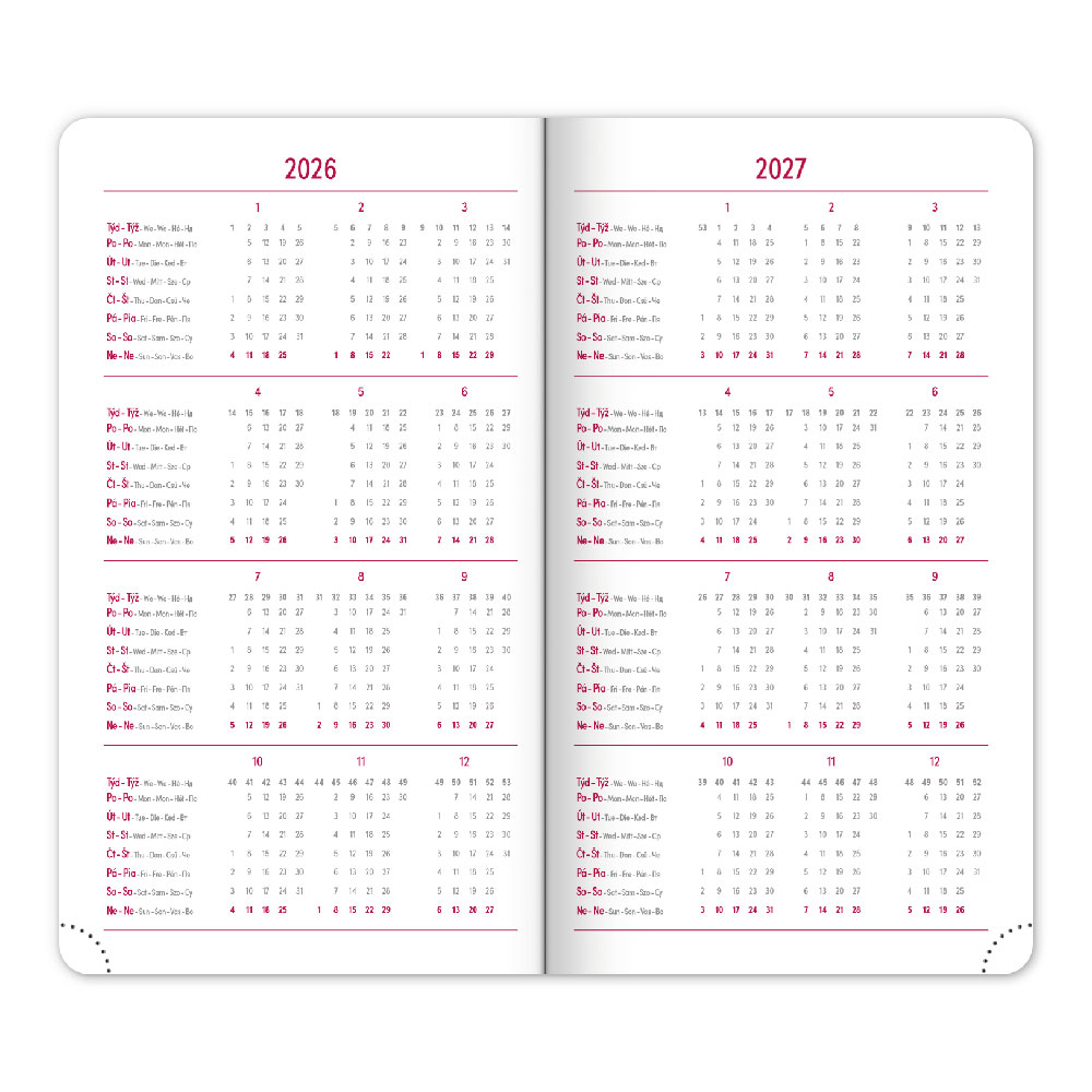 Kalendarz: tygodniowy w 6 językach (CZ, SK, EN, DE, HU, RU)