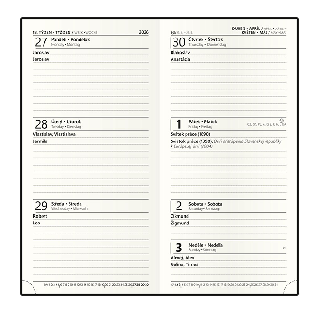 Kalendarz: tygodniowy nominalny czeski i słowacki