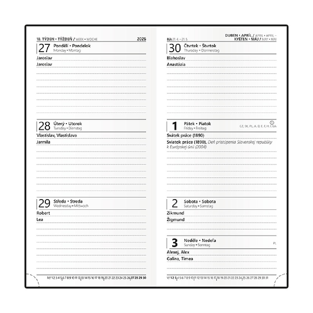 Kalendarz: tygodniowy nominalny czeski i słowacki