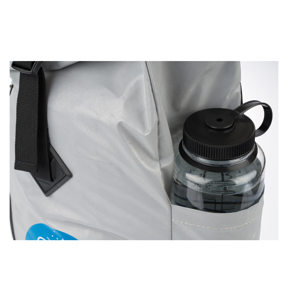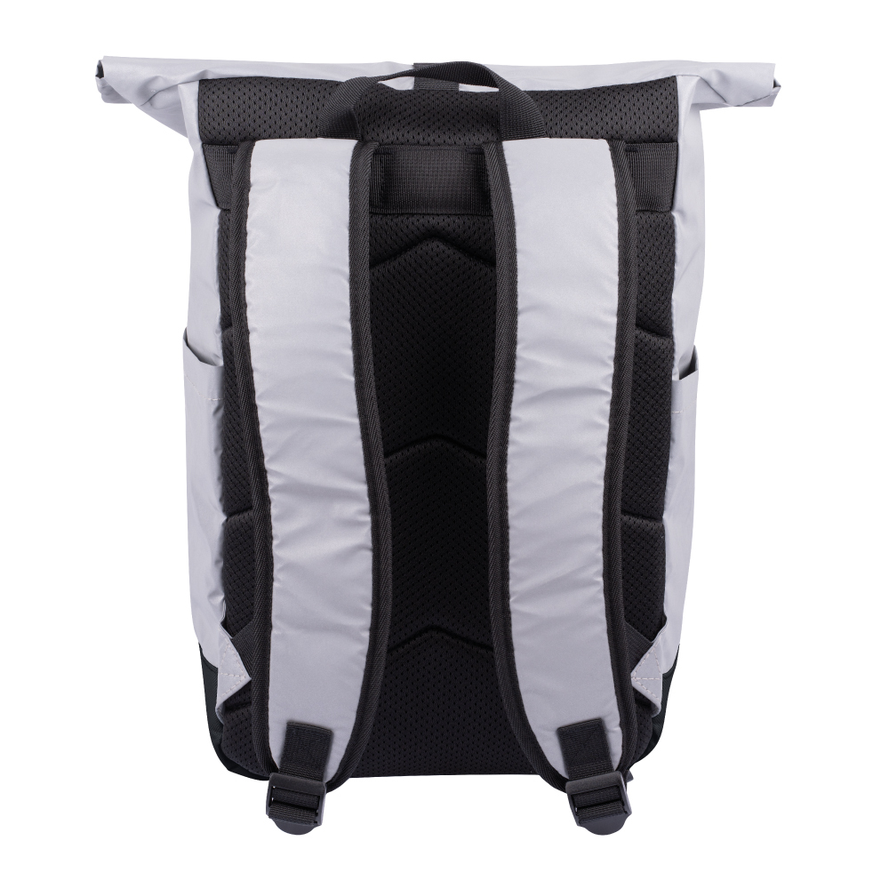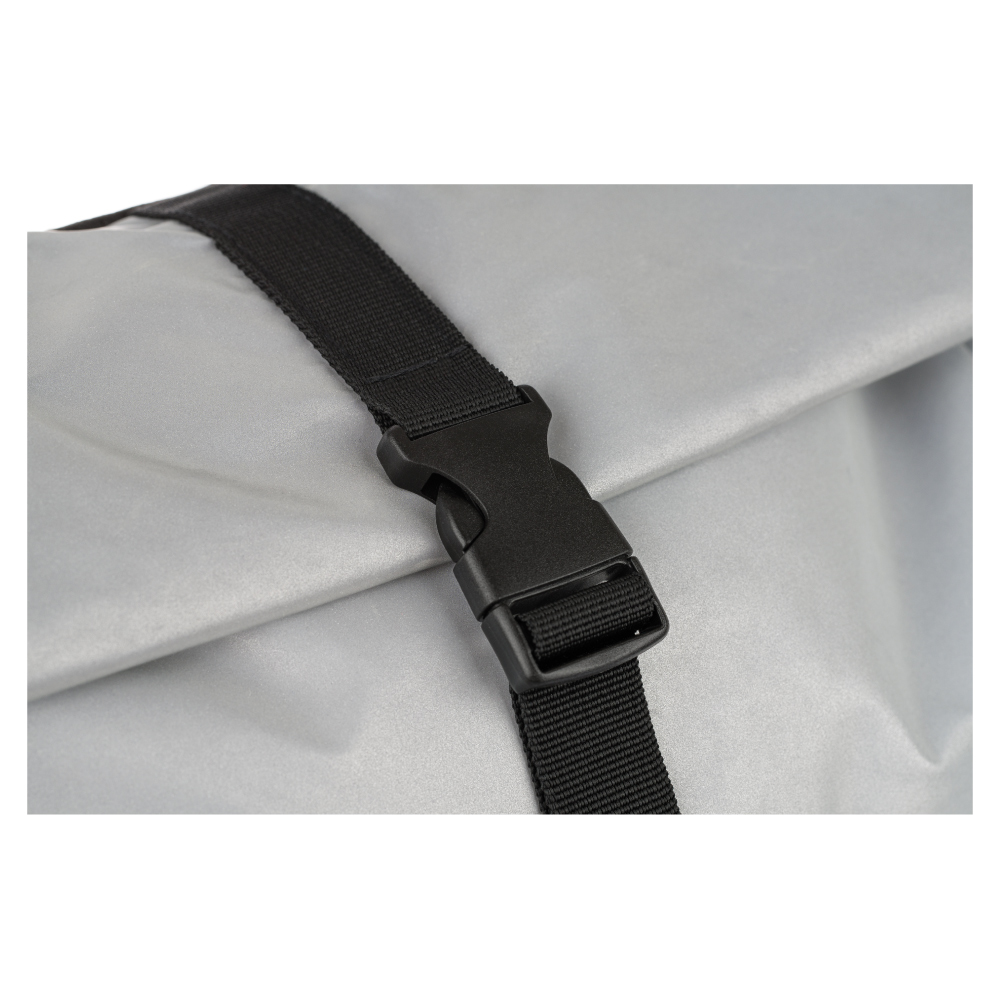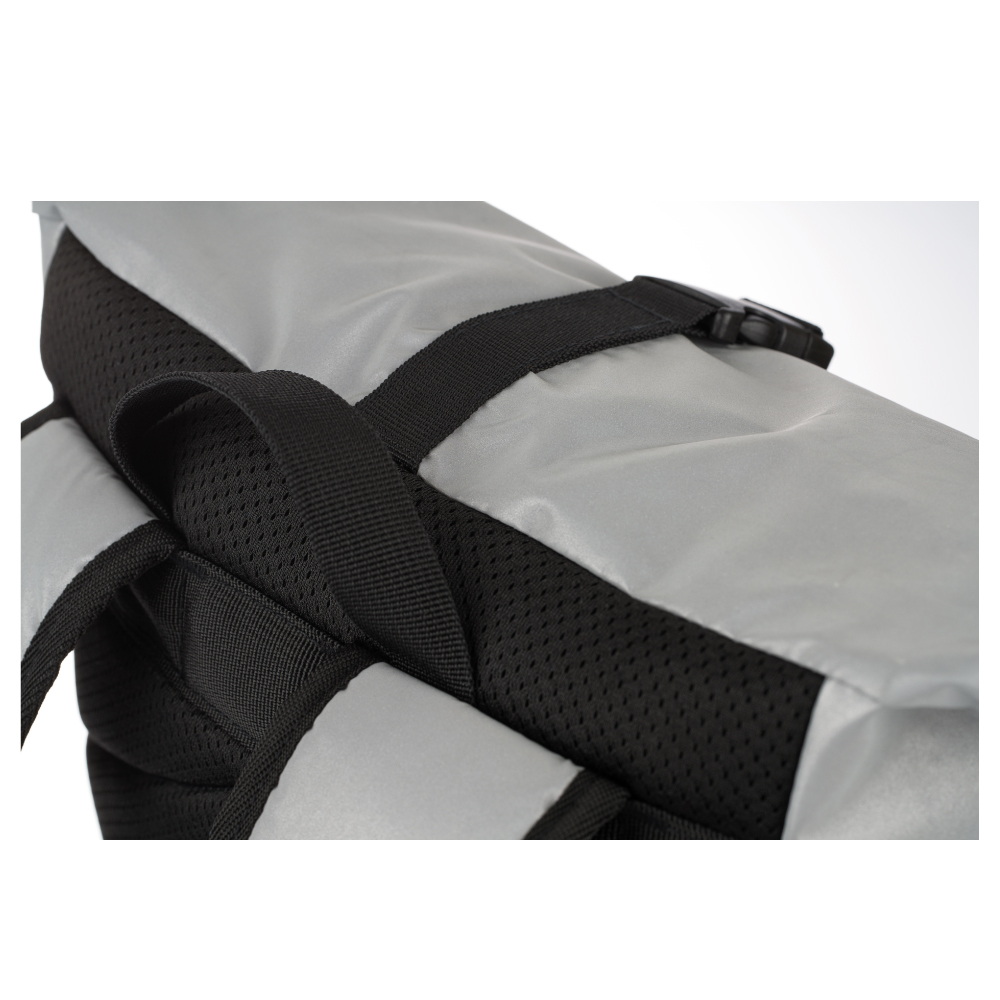 • Srebrny roll-top plecak uszyty z odblaskowego materiału.