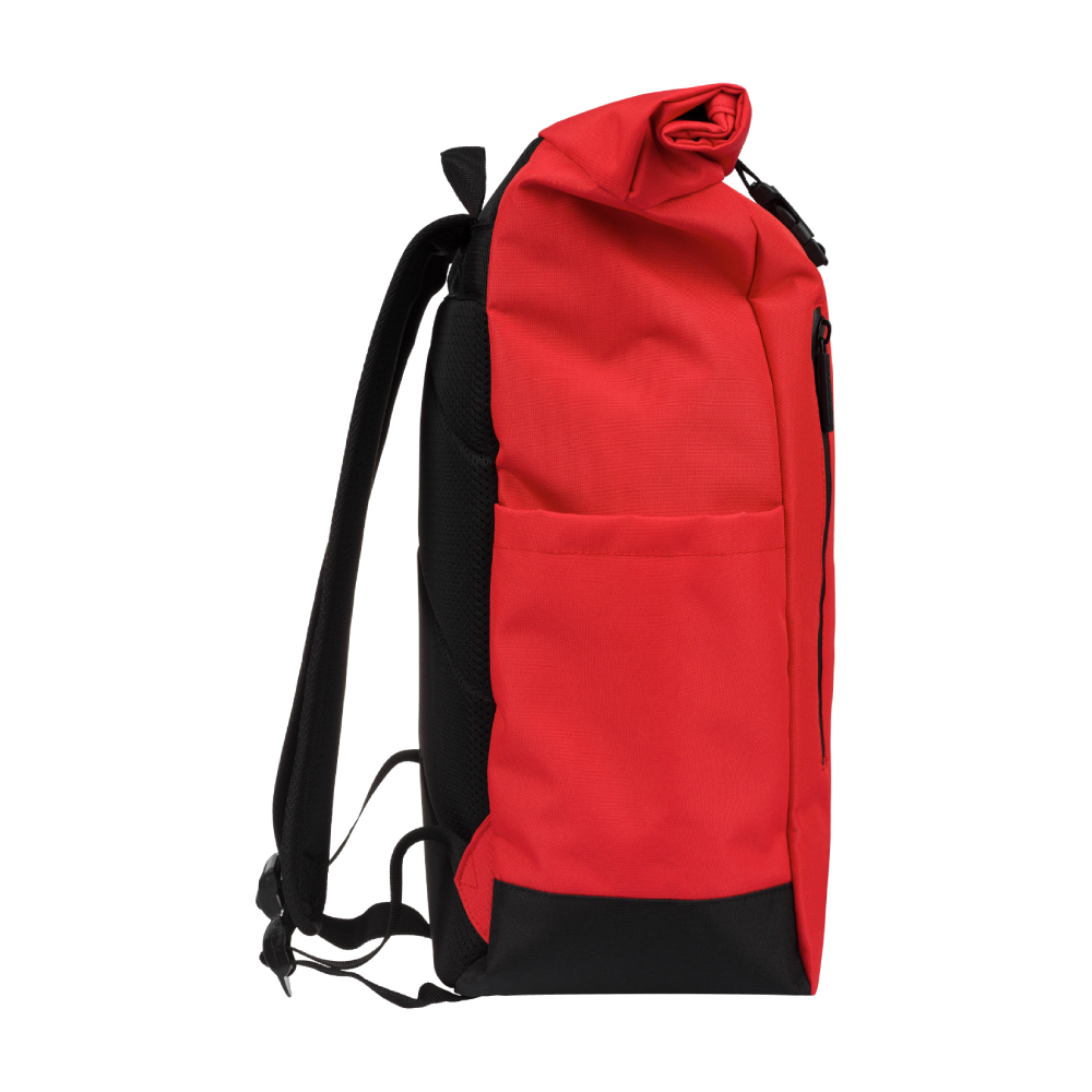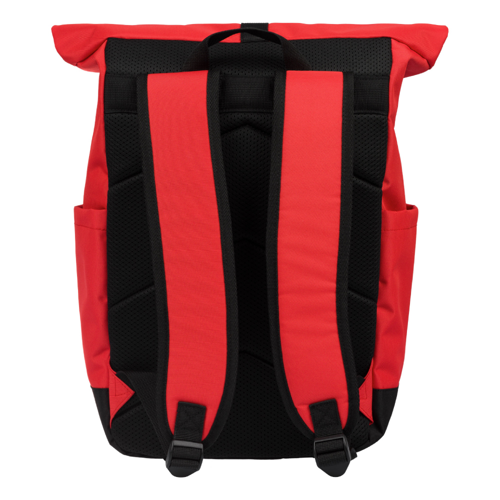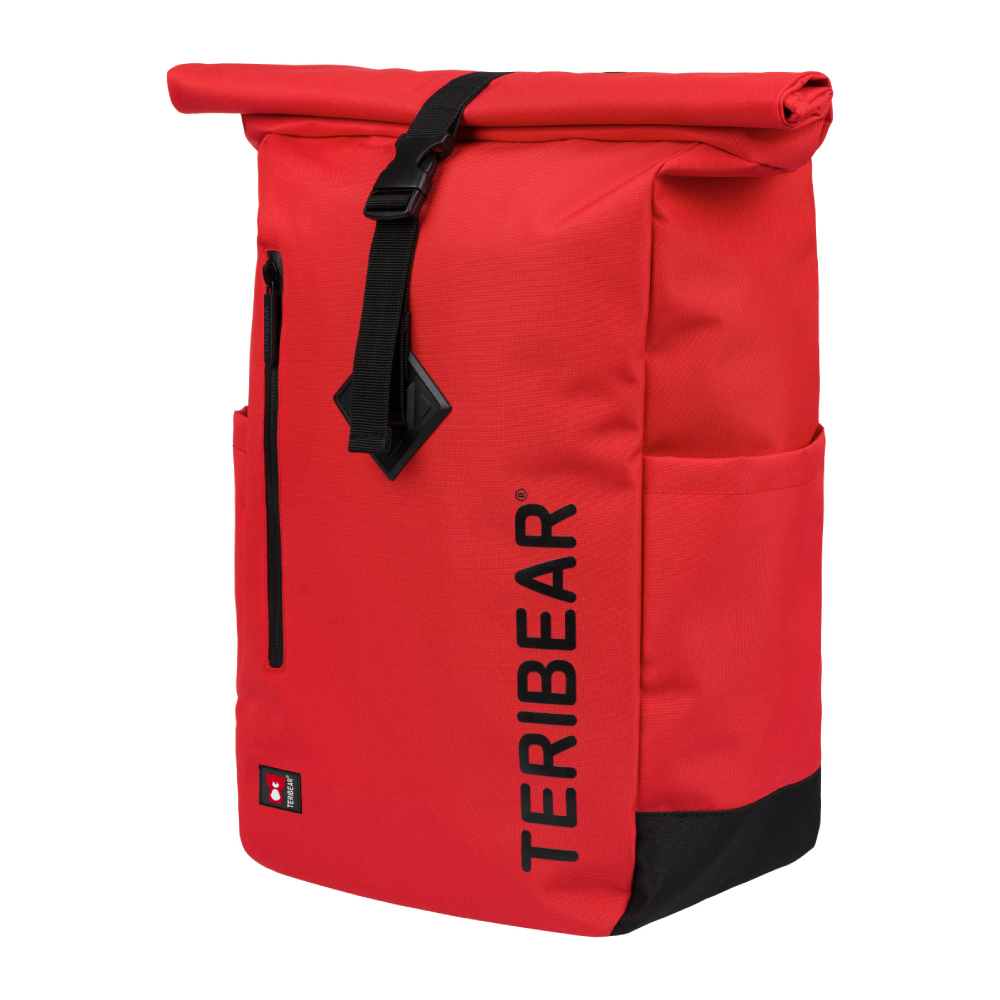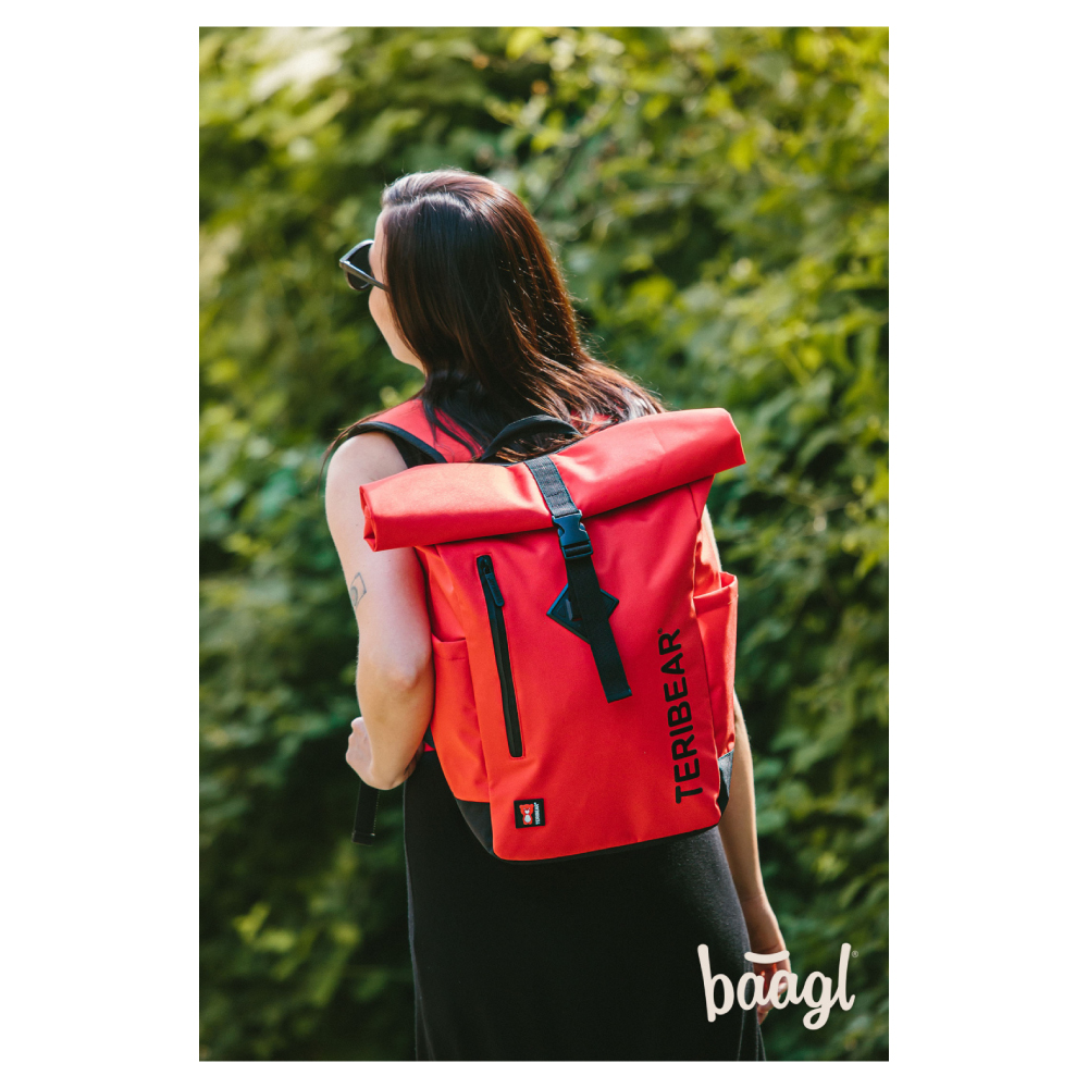 • Srebrny roll-top plecak uszyty z odblaskowego materiału.